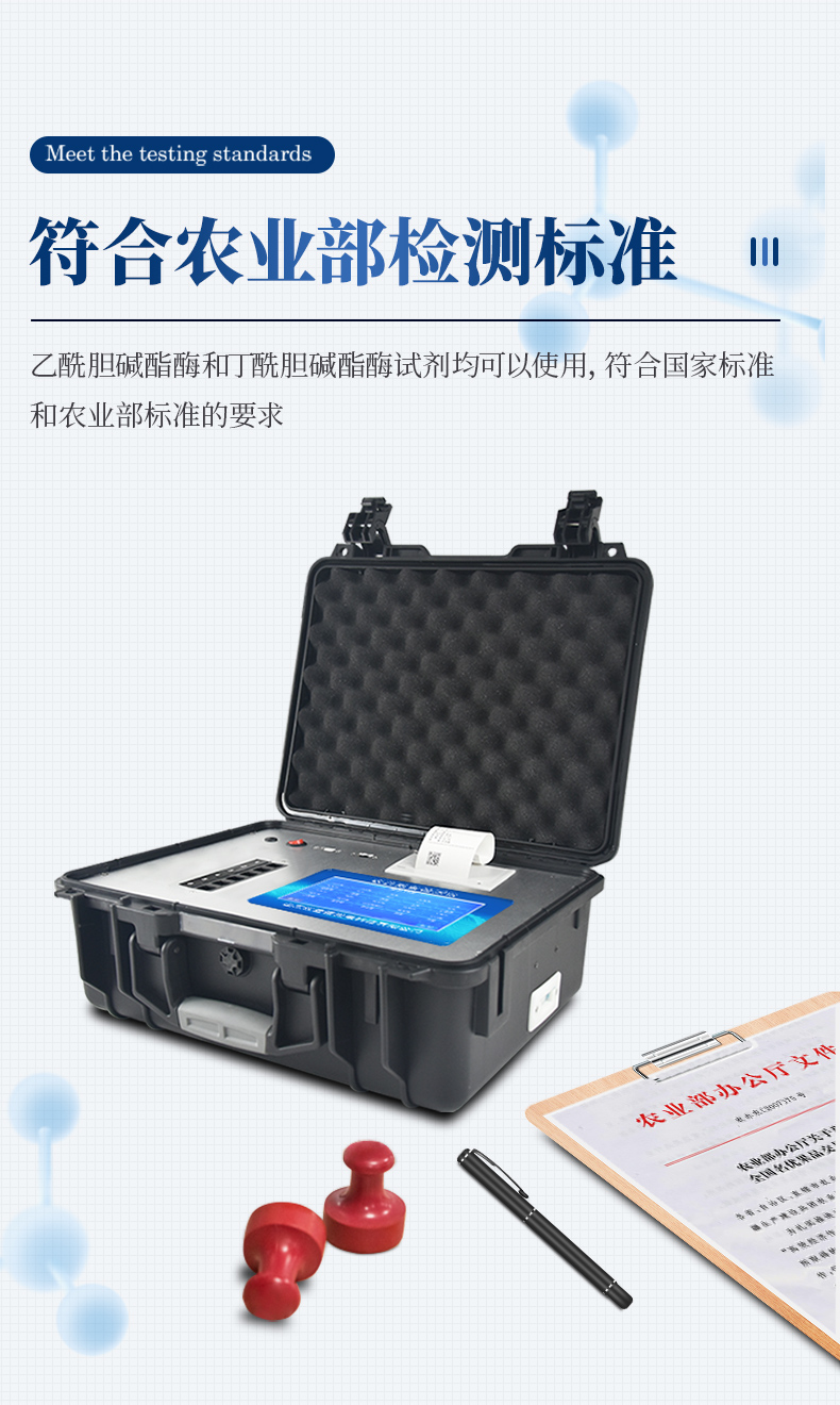 檢測標準:依據(jù)國家標準方法(GB/T5009.199-2003)以及世界衛(wèi)生組織WHO、世界糧農(nóng)組織FAO殘留農(nóng)藥檢測標準、世界環(huán)境保護局EPA參照攝入量等要求來設(shè)計。采用酶抑制率比色法對水果、蔬菜等農(nóng)產(chǎn)品中有機磷和氨基甲酸酯類農(nóng)藥含量進行快速準確的檢測。