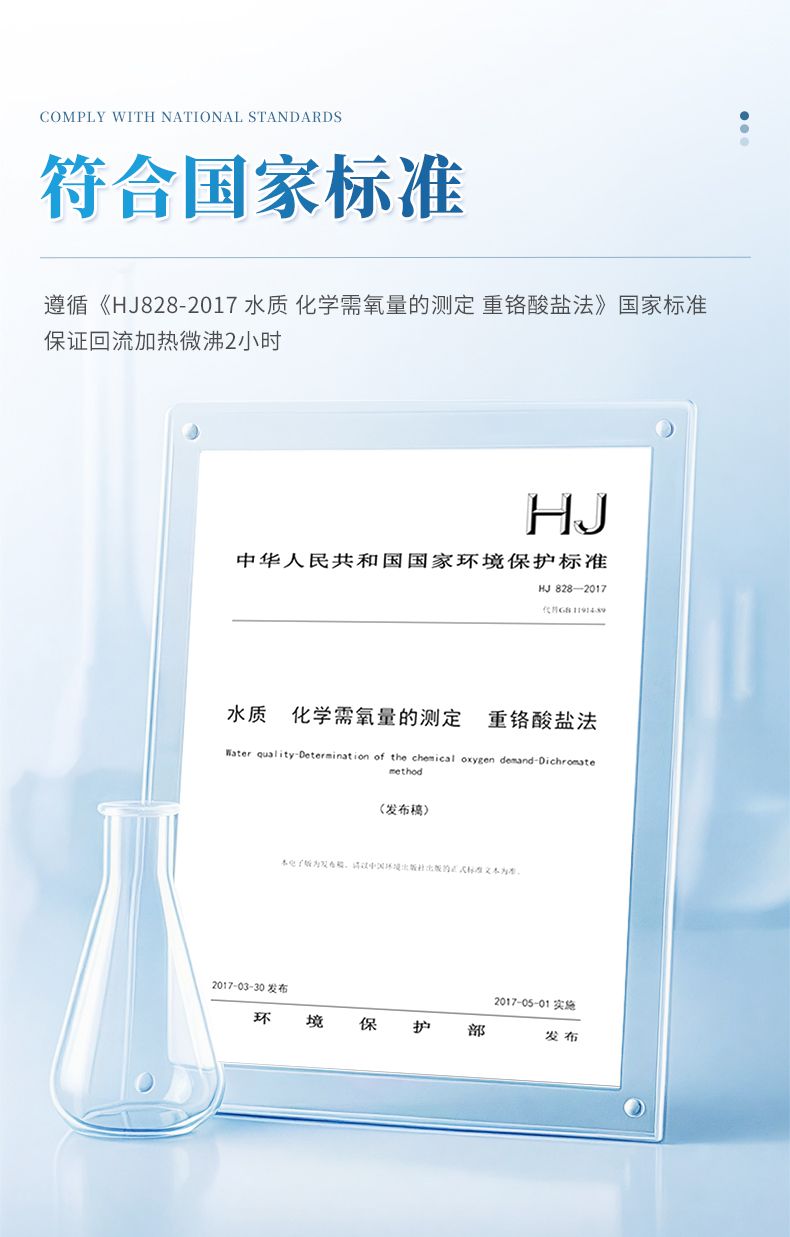 化學(xué)需氧量(COD)智能回流消解器遵循了國家標(biāo)準(zhǔn)《HJ828-2017 水質(zhì) 化學(xué)需氧量的測定 重鉻酸鹽法》的基本原則,保證了回流加熱微沸2小時的消解操作,試劑溶液的配制和加入量與國標(biāo)法一致,確保可靠準(zhǔn)確的分析結(jié)果。