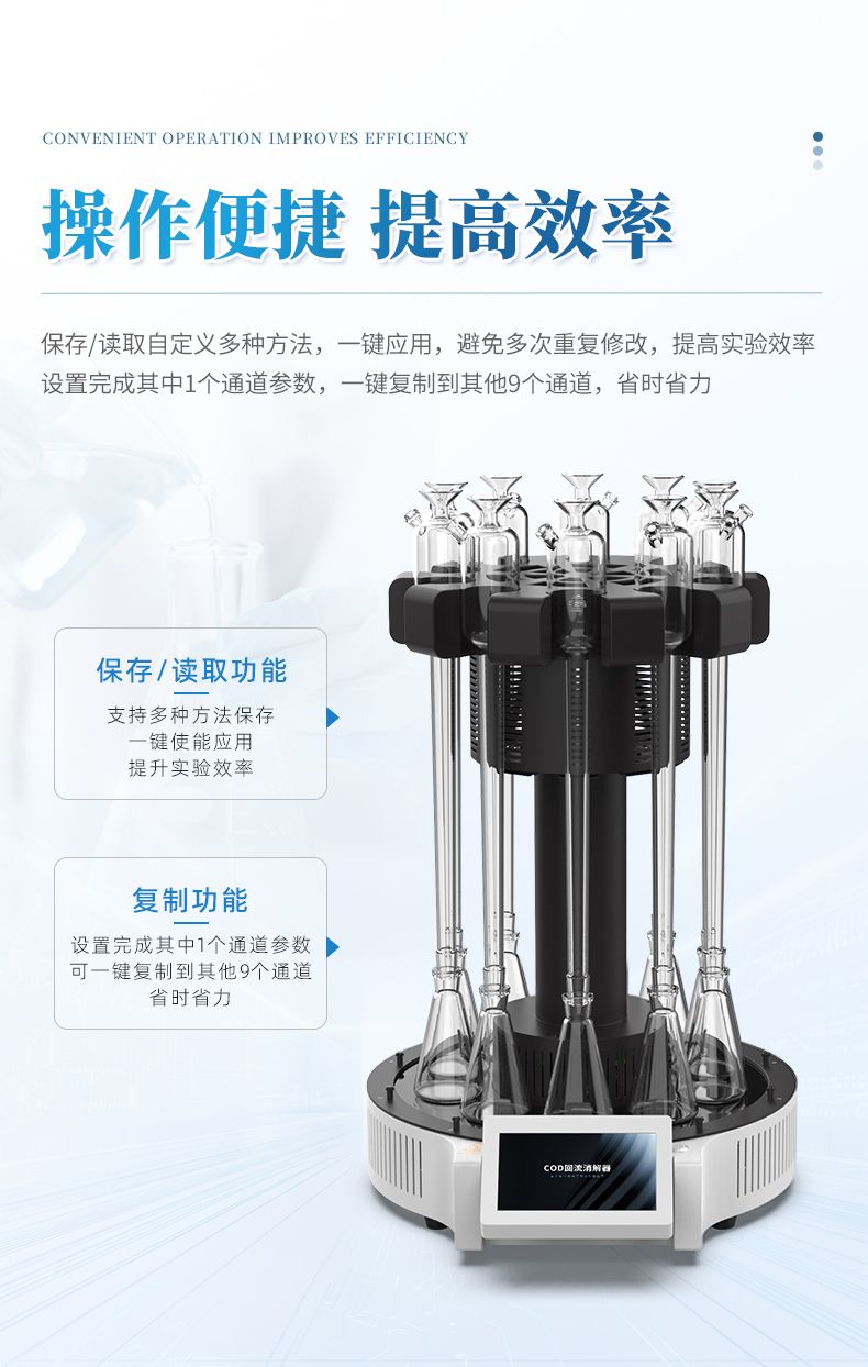 化學(xué)需氧量(COD)智能回流消解器遵循了國家標(biāo)準(zhǔn)《HJ828-2017 水質(zhì) 化學(xué)需氧量的測定 重鉻酸鹽法》的基本原則,保證了回流加熱微沸2小時(shí)的消解操作,試劑溶液的配制和加入量與國標(biāo)法一致,確保可靠準(zhǔn)確的分析結(jié)果。