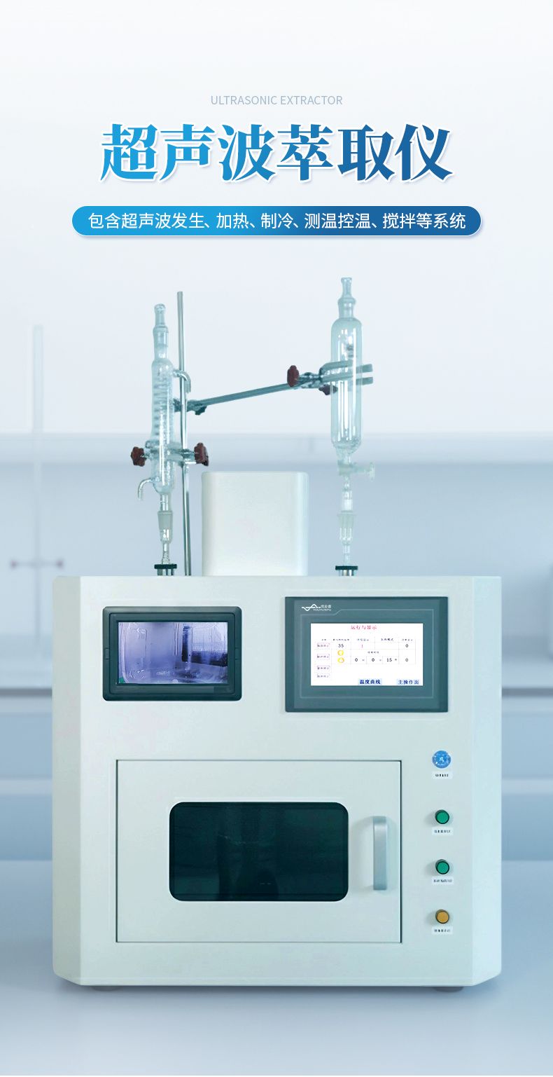 超聲波萃取儀使用超聲波技術(shù)然后結(jié)合運(yùn)用低溫恒溫系統(tǒng)作為輔助,整套系統(tǒng)包含大功率超聲波 發(fā)生系統(tǒng)、加熱系統(tǒng)、壓縮機(jī)制冷系統(tǒng)、測溫控溫系統(tǒng)、攪拌系統(tǒng)等,在能控制反應(yīng)體系溫度的 條件下,能有效促進(jìn)反應(yīng)物的高效率混合及促進(jìn)催化化學(xué)反應(yīng)。