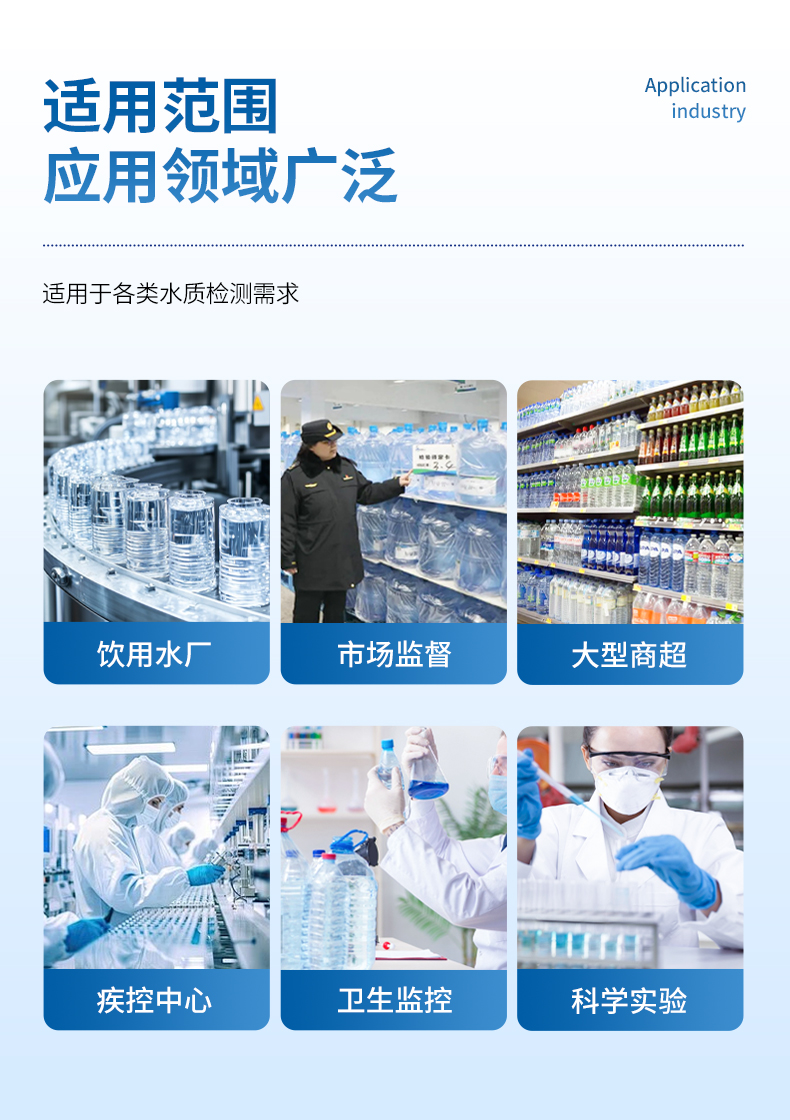 能夠廣泛的應用于飲用水廠生產(chǎn)檢驗、市場監(jiān)督部門質(zhì)量監(jiān)督、大型商超質(zhì)量抽檢、疾病控制中心、衛(wèi)生監(jiān)控等。