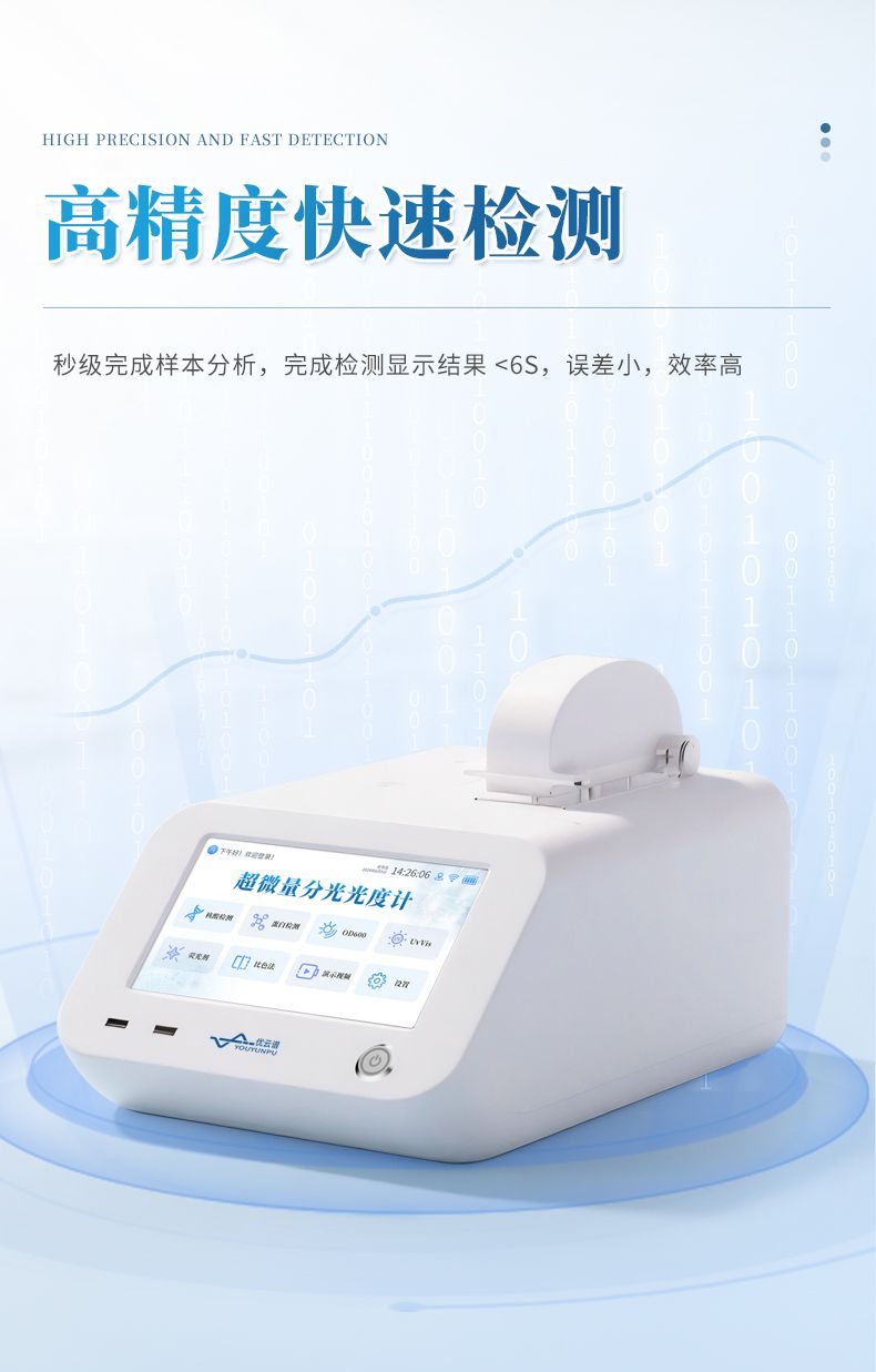超微量分光光度計(jì)是一種基于紫外-可見(jiàn)分光光度法(UV-Vis)的高精度生物檢測(cè)儀器,專為極低樣本量(0.5-2μL)的核酸(DNA/RNA)、蛋白質(zhì)、細(xì)胞裂解液等生物樣品的濃度與純度快速分析設(shè)計(jì)。