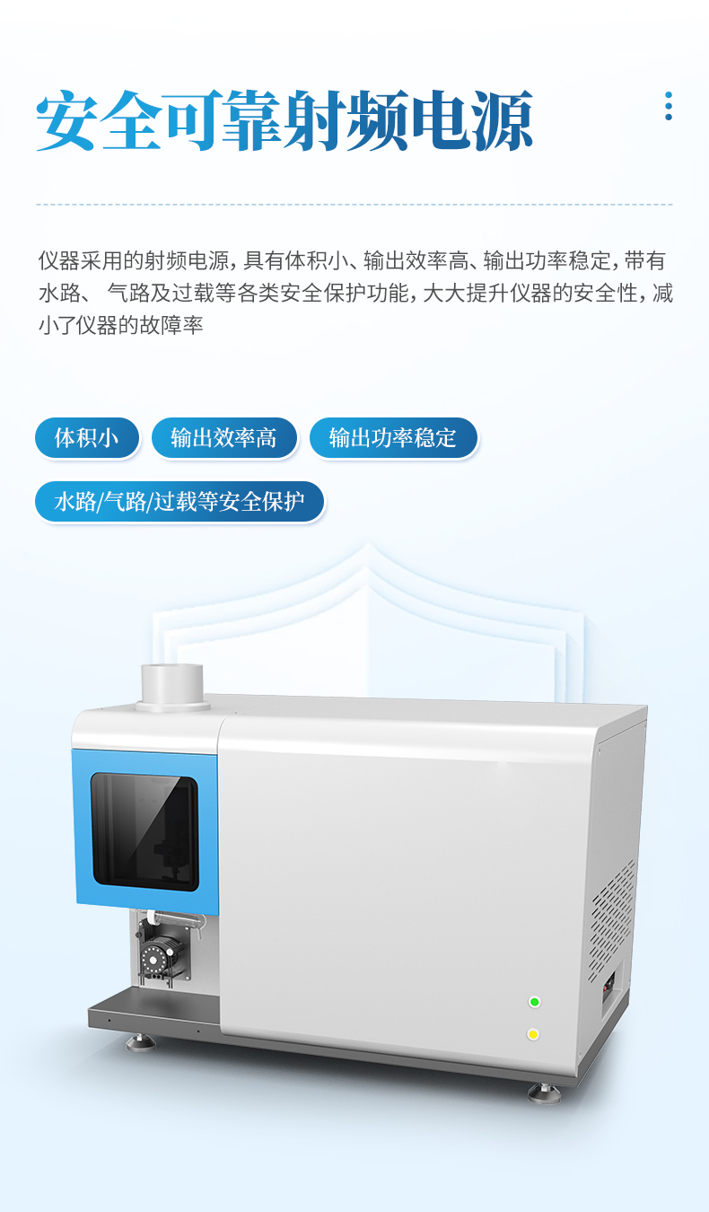 儀器采用的射頻電源,具有體積小、輸出效率高、輸出功率穩(wěn)定,帶有水路、氣路及過載等各類安全保護(hù)功能,大大提升儀器的安全性,減小了儀器的故障率。