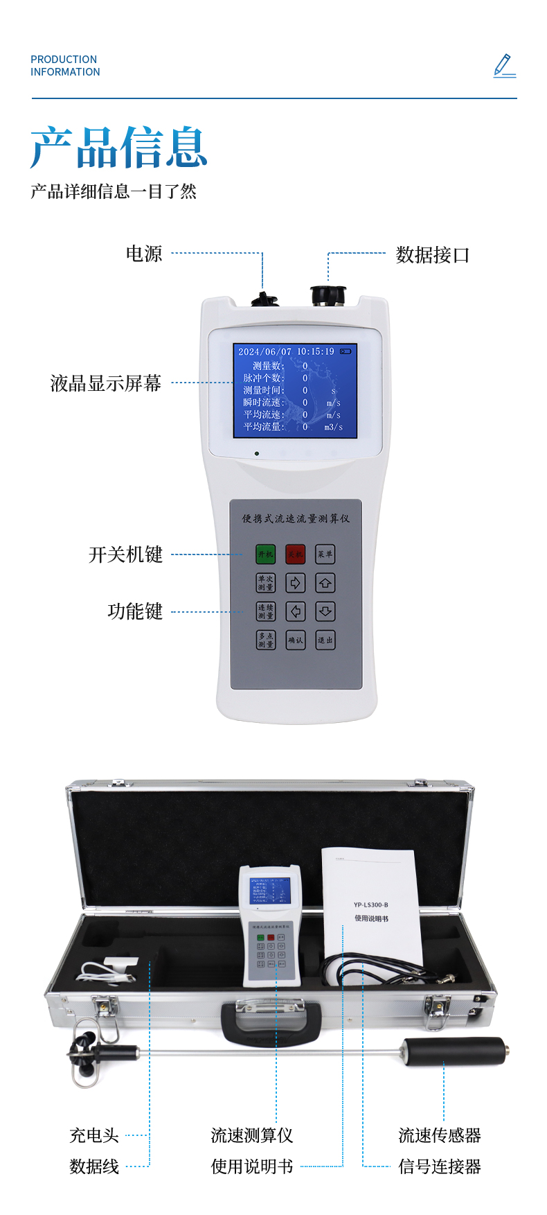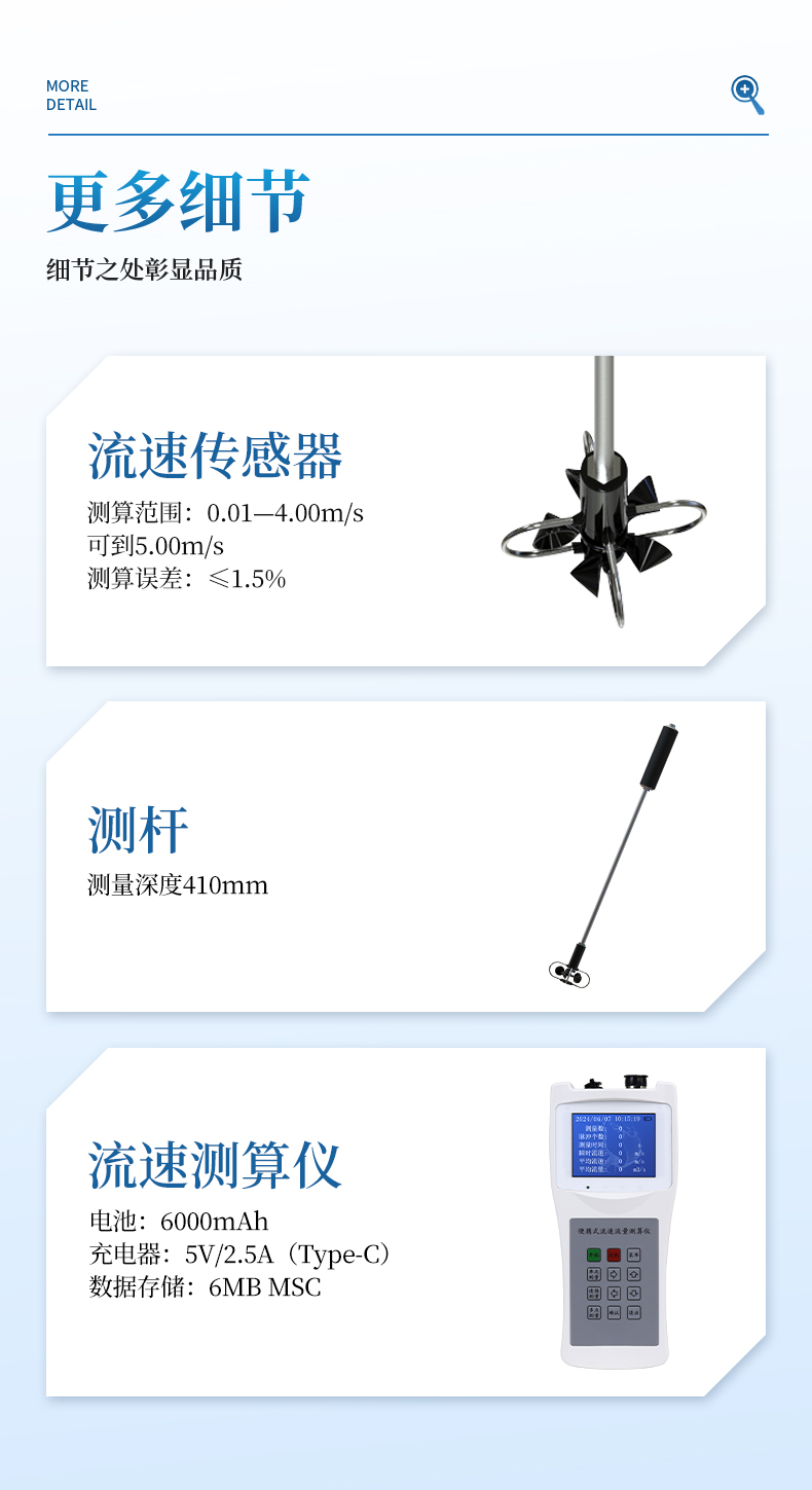 ①流速傳感器、②信號(hào)連接器、③流速測(cè)算儀、④充電頭、⑤數(shù)據(jù)線