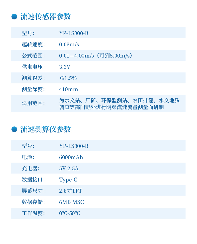LS300-B型便攜式流速流量儀(簡稱便攜式流速儀)是專門為水文站、廠礦、環(huán)保監(jiān)測(cè)站、農(nóng)田排灌、水文地質(zhì)調(diào)查等部門在野外進(jìn)行明渠流速流量測(cè)量而研制的。