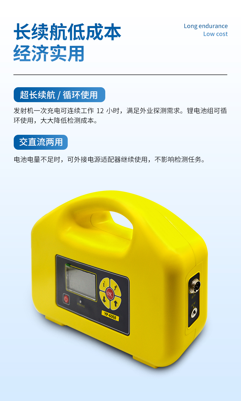 發(fā)射機(jī)配備了大容量鋰電池組, 一次充電, 可滿足外業(yè)探測一個工作日供電需要, 并可循環(huán)使用,大大降低了檢測成本。
