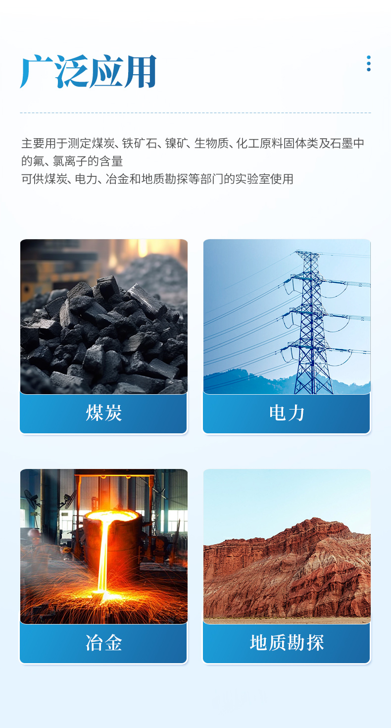 氟氯離子測(cè)定儀(高溫燃燒水解裝置、氟氯離子計(jì)、氟氯電極)主要用于測(cè)定煤炭、鐵礦石、鎳礦、生物質(zhì)、化工原料固體類及石墨中的氟、氯離子的含量,符合GBT4633-2014煤中氟的測(cè)定方法、GBT3558-2014煤中氯的測(cè)定方法國(guó)家標(biāo)準(zhǔn)要求。檢測(cè)原理:利用高溫燃燒水解—氟/氯離子選擇性電極法測(cè)定煤中總氟、氯含量。可供煤炭、電力、冶金和地質(zhì)勘探等部門的實(shí)驗(yàn)室使用。