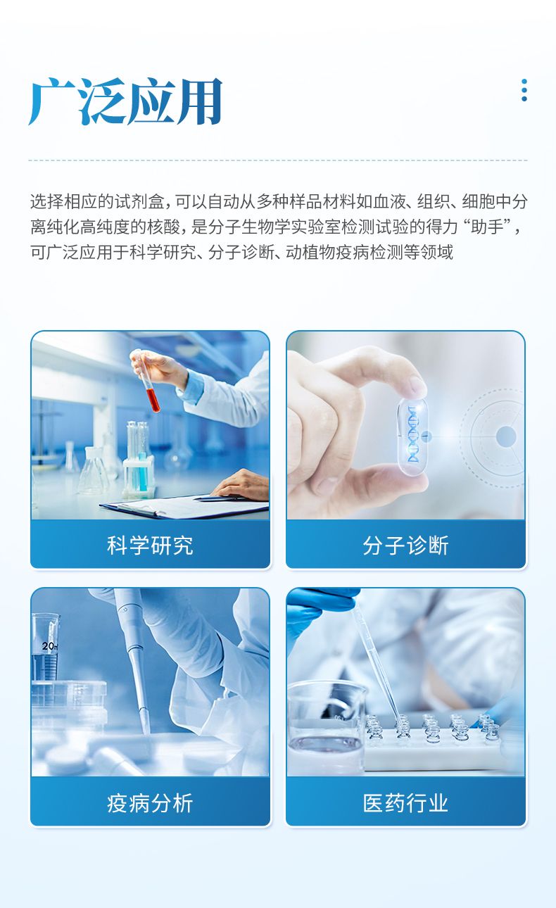 核酸提取儀通過磁珠法提取核酸,選擇相應的試劑盒就可以自動的從多種樣品材料如血液、組織、細胞中分離純化高純度的核酸。具有兼容性強(適配預封裝提取試劑盒,也可適配單頭份試劑)、提取速度快、提取回收率高、操作簡便的優(yōu)點,是分子生物學實驗室檢測試驗的得力“助手”??蓮V泛應用于科學研究、分子診斷、動植物疫病檢測等領域。