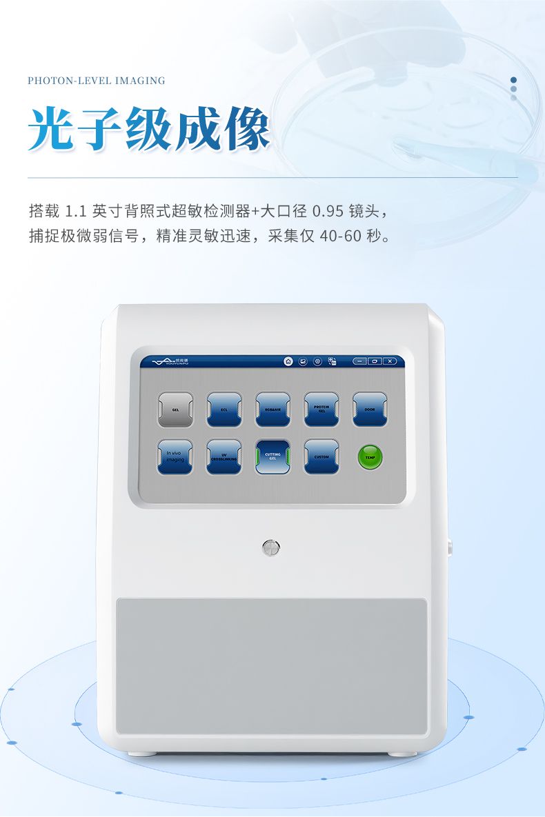 采用獨特的光子級成像技術(shù)、超低降噪處理技術(shù),結(jié)合大耙面背照式超敏檢測器以及大通 光透鏡,使得極微弱信號捕捉變的更容易。靈敏度遠超同類產(chǎn)品,成像效果更好,采集速 度提升 2-3 倍(原需 2 分鐘,現(xiàn)僅 40-60 秒),避免科研成果錯失。我司研發(fā)的新一代 超敏化學(xué)發(fā)光成像系統(tǒng)完全可替代進口同類產(chǎn)品。
