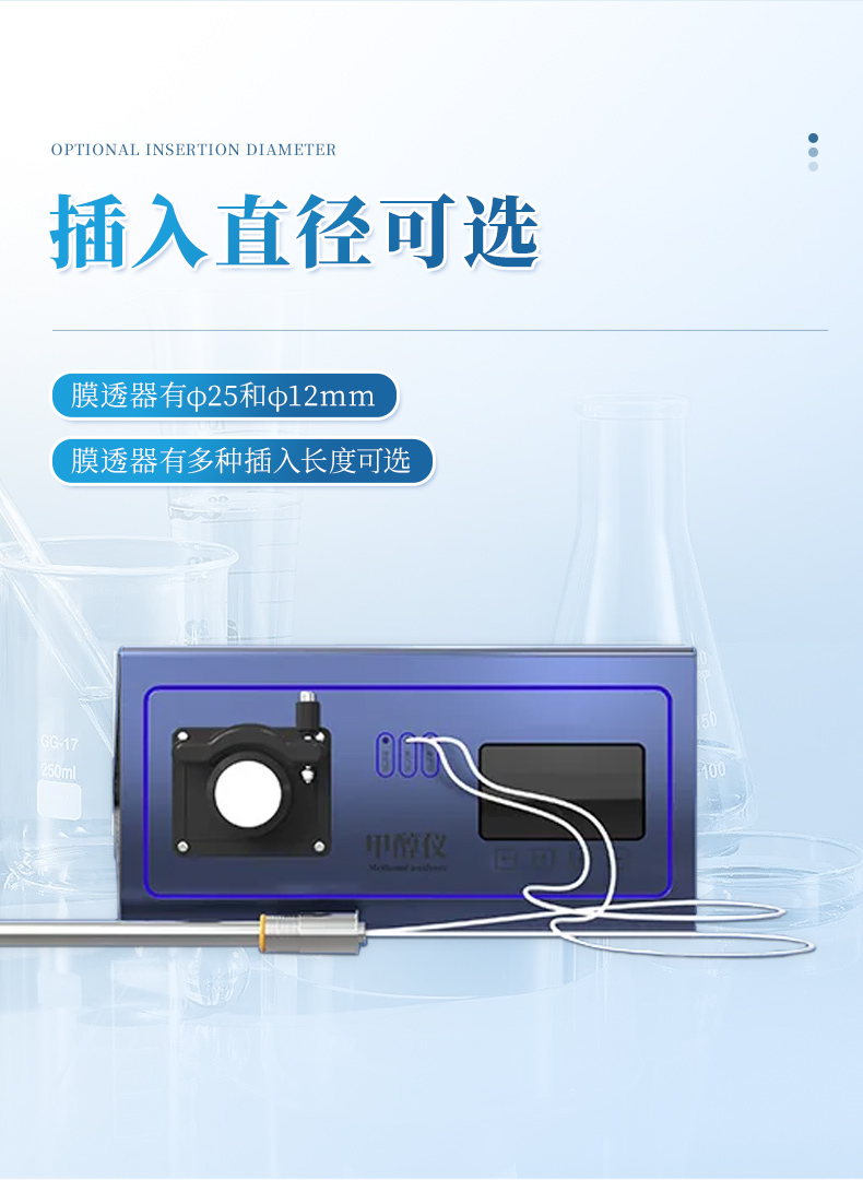在線測量發(fā)酵液中甲醇濃度,膜透器選用了不銹鋼絲網(wǎng)增強的高分子甲醇透過膜,可直接蒸汽滅菌。檢測傳感器工作在恒溫器中克服了傳感器響應(yīng) 的環(huán)境溫度影響,脫透器有φ25和φ12mm插入直徑可選,和有多種插入長 度可選,儀器具有非線性校正,程控標(biāo)定,高低位報警,數(shù)字溫度補償和兩級密碼保護重要數(shù)據(jù)及菜單組態(tài)等功能