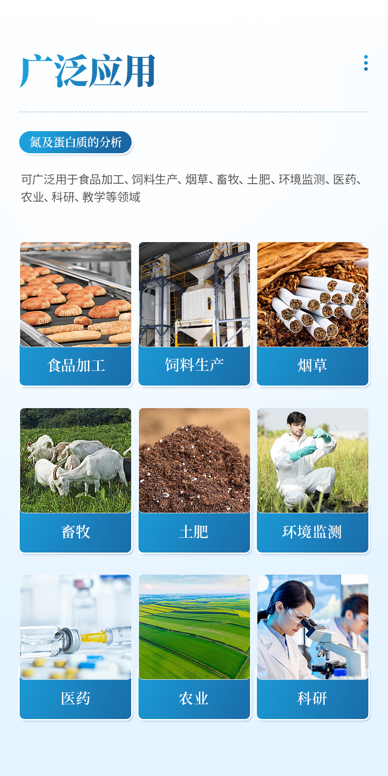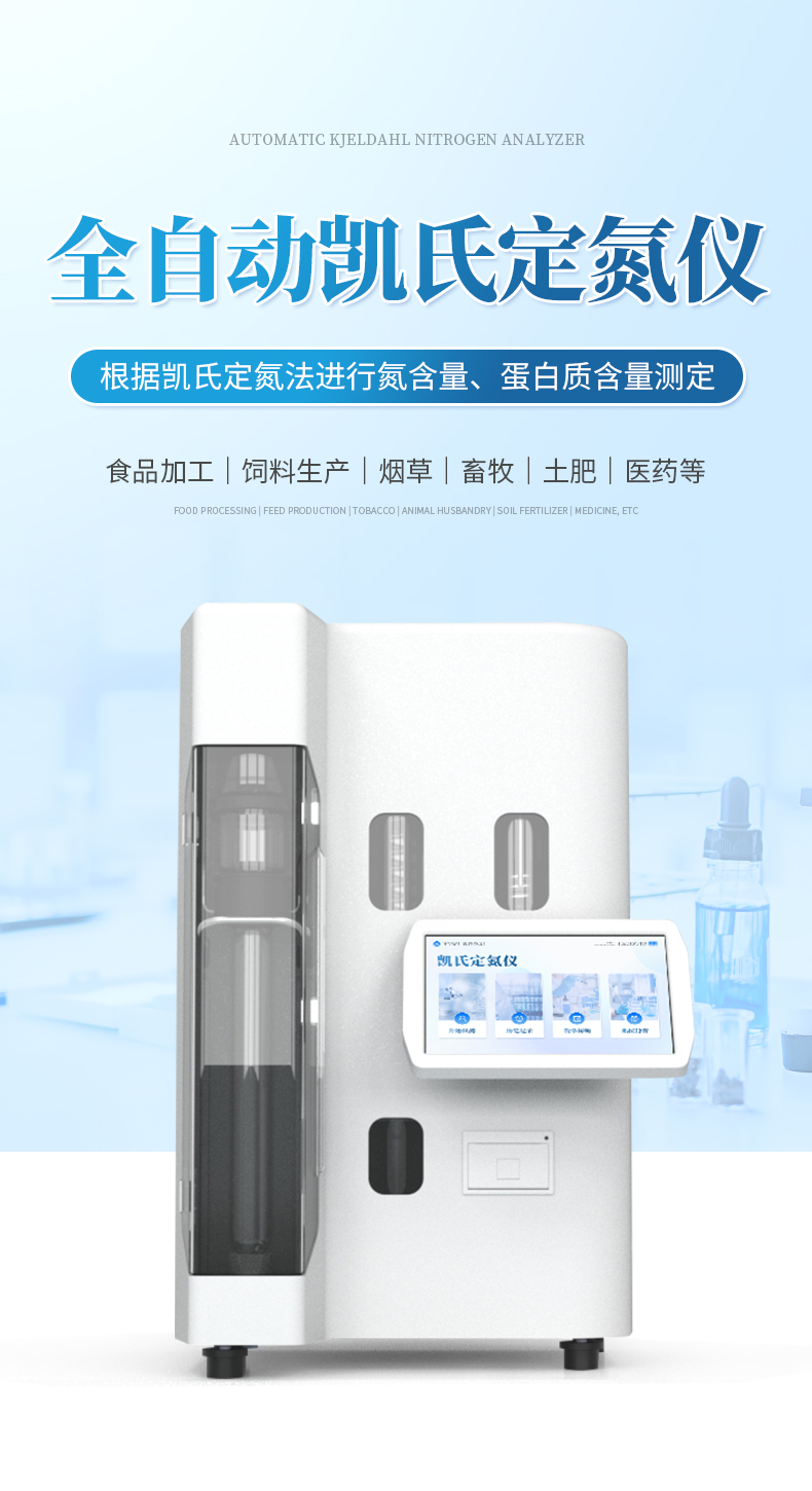 全自動凱氏定氮儀是根據(jù)凱氏定氮法進行氮含量、蛋白質含量測定的自動化儀器??蓮V泛用于食品加工、飼料生產(chǎn)、煙草、畜牧、土肥、環(huán)境監(jiān)測、醫(yī)藥、農(nóng)業(yè)、科研、教學等領域氮及蛋白質的分析。