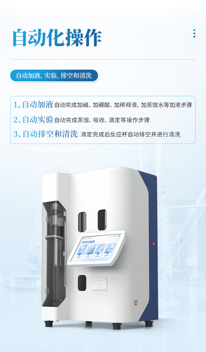 全自動凱氏定氮儀所有步驟自動按程序完成。為檢測人員在進行氮及蛋白質測定中提供了極大的方便。具有使用安全、可靠、操作簡單、省時省力等特點。