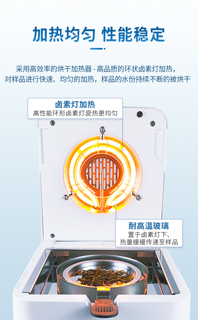 該系列快速水分測定儀應(yīng)用了國際烘箱干燥法原理,測定結(jié)果與烘箱法水分測定具有良好的一致性,工作效率卻遠(yuǎn)遠(yuǎn)高于烘箱法水分測定,一般樣品只需要幾分鐘即可測量完畢,因此受到廣大用戶的青睞與好評。