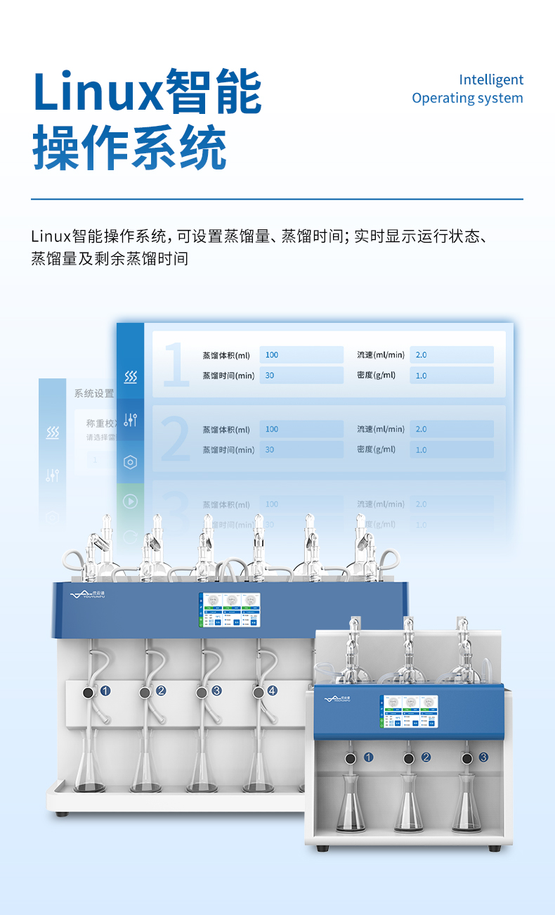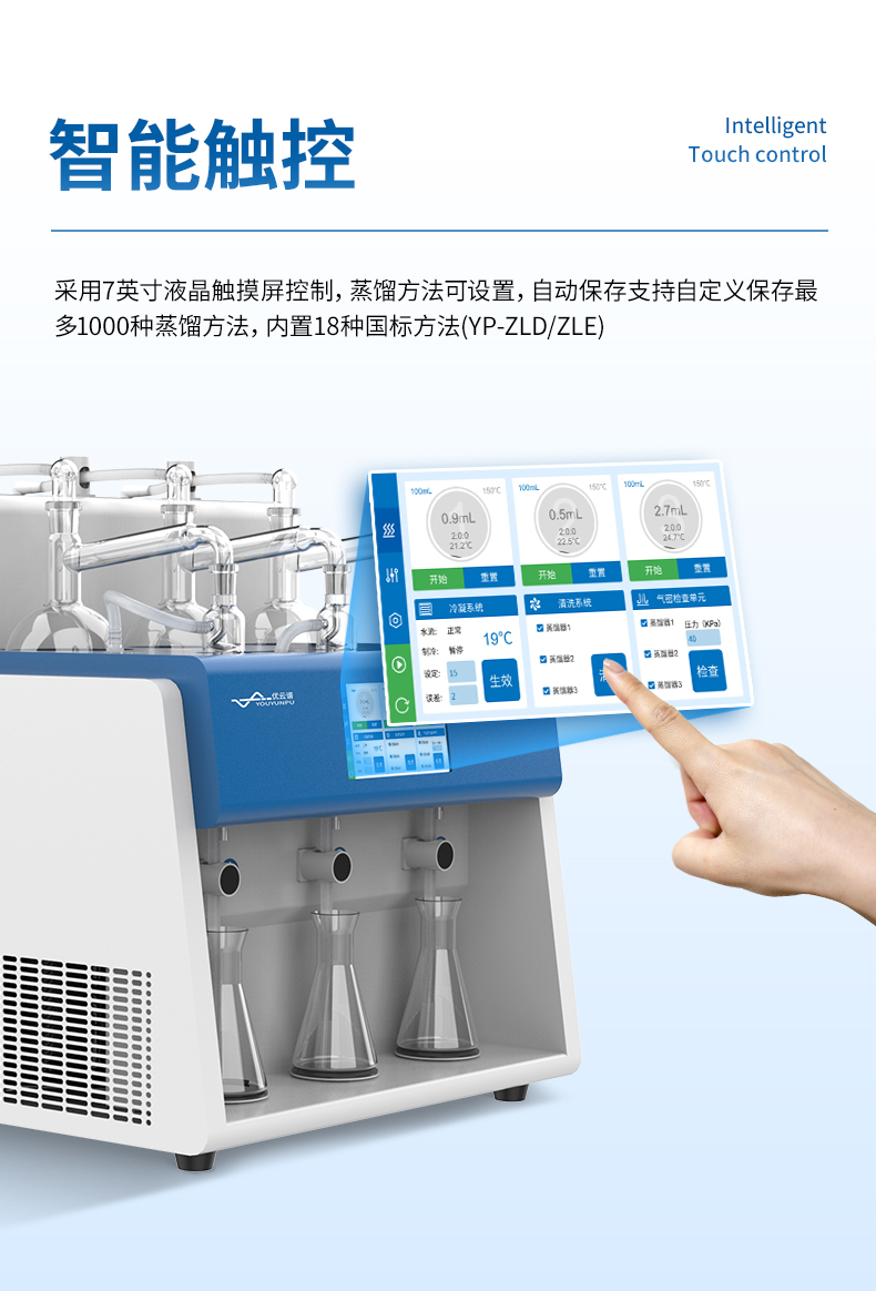 3.智能觸控:7寸液晶觸摸屏,支持自定義保存最多1000種蒸餾方法,內(nèi)置18種國標(biāo)方法。