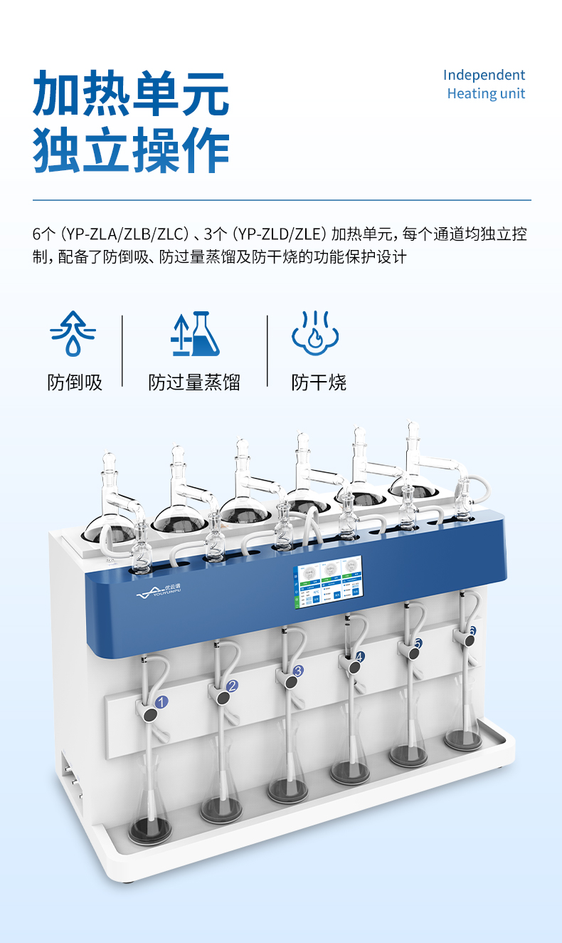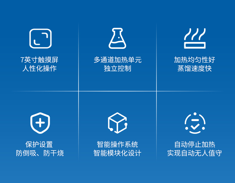 2.多通道獨立控制:3個加熱單元各自獨立,配備防倒吸、防過量蒸餾及防干燒保護。