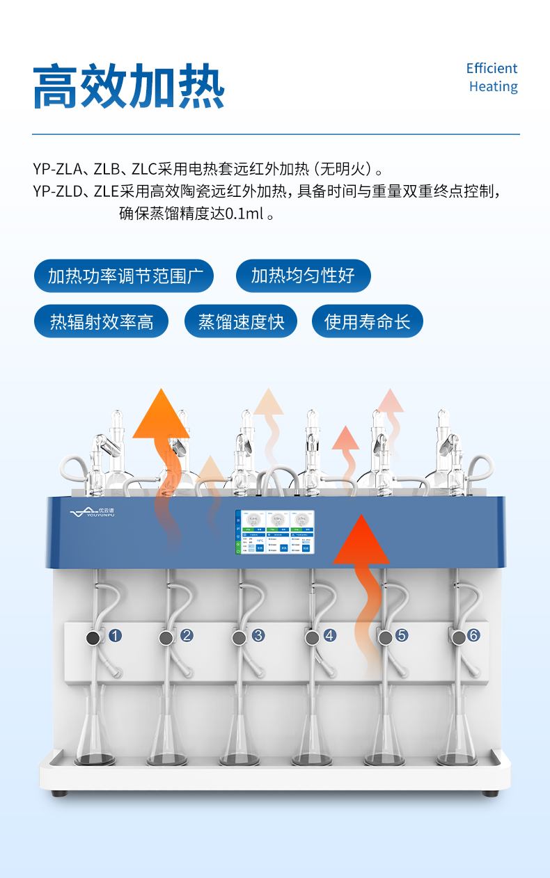 4.精準(zhǔn)控制:采用高效陶瓷遠紅外加熱,具備時間與重量雙重終點控制,確保蒸餾精度達0.1ml。