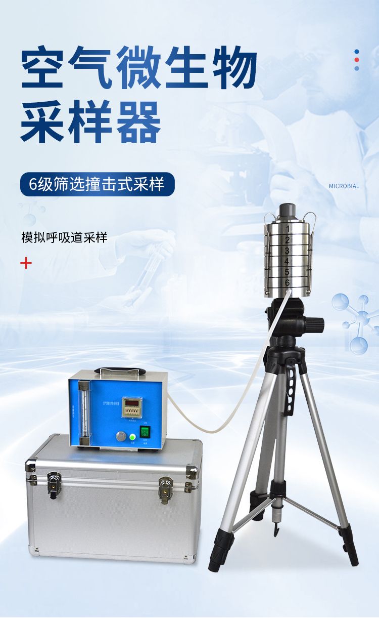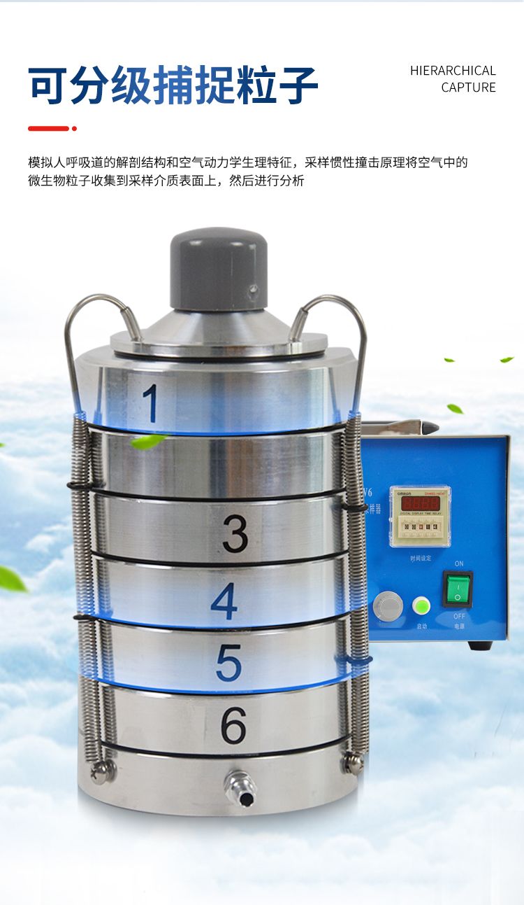 整個儀器是由撞擊器、主機(流量計)、定時器、三腳架組成。撞擊器是6層有微小孔眼的鋁合金圓盤。圓盤下放瓊脂平皿,每圓盤間有密封膠圈,在通過三個彈簧掛 鉤把圓盤牢固地聯(lián)在一起。每個圓盤上有400個成環(huán)行排列、逐層減小、尺寸精確的小孔,標(biāo)準(zhǔn)采樣流量為1立方呎(28.3L/min)。當(dāng)含有微生物粒子 的氣流進入最上層的采樣口后,由于氣流的逐層增高,不同大小的微生物粒子按空氣動力學(xué)特征分別撞擊在相應(yīng)的瓊脂表面上。捕獲在各級上的粒子大小范圍是由該 級孔眼的氣流速度和上一級的粒子截阻率而決定的。第1、2級類似人的上呼吸道捕獲的粒子,第3~6級類似人的下呼吸道捕獲的粒子,這就相當(dāng)程度上復(fù)制了這 些粒子在呼吸道的穿透作用和沉著部位。