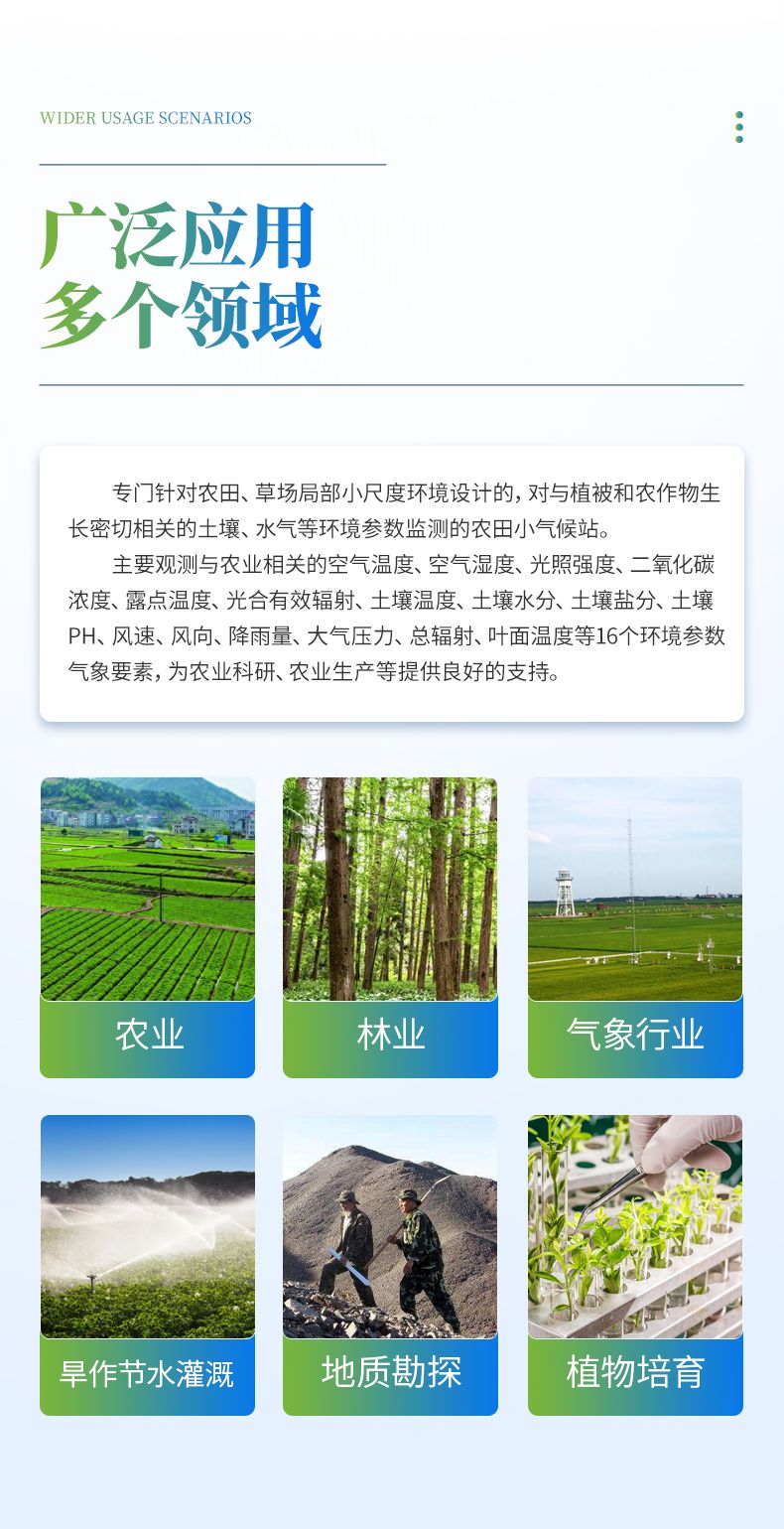 廣泛應(yīng)用于農(nóng)業(yè)、林業(yè)、環(huán)保、水利、氣象行業(yè)、旱作節(jié)水灌溉、地質(zhì)勘探、植物培育等領(lǐng)域。