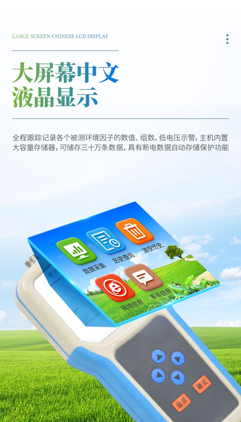 大屏幕中文液晶顯示,全程跟蹤記錄各個(gè)被測(cè)環(huán)境因子的數(shù)值、組數(shù)、低電壓示警,主機(jī)內(nèi)置大容量存儲(chǔ)器,可儲(chǔ)存三十萬(wàn)條數(shù)據(jù),具有斷電數(shù)據(jù)自動(dòng)存儲(chǔ)保護(hù)功能。