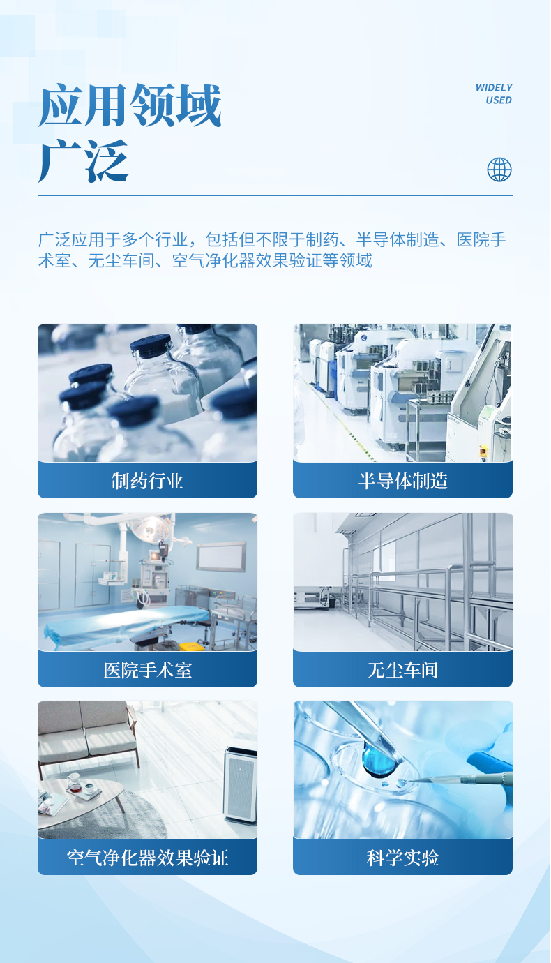 手持塵埃粒子計數(shù)器是一種便攜式的檢測設備,專門用于快速測量空氣中的塵埃、顆粒物以及其他微小顆粒的數(shù)量和大小分布。這類儀器廣泛應用于多個行業(yè),包括但不限于制藥、半導體制造、醫(yī)院手術室、無塵車間、空氣凈化器效果驗證等領域。