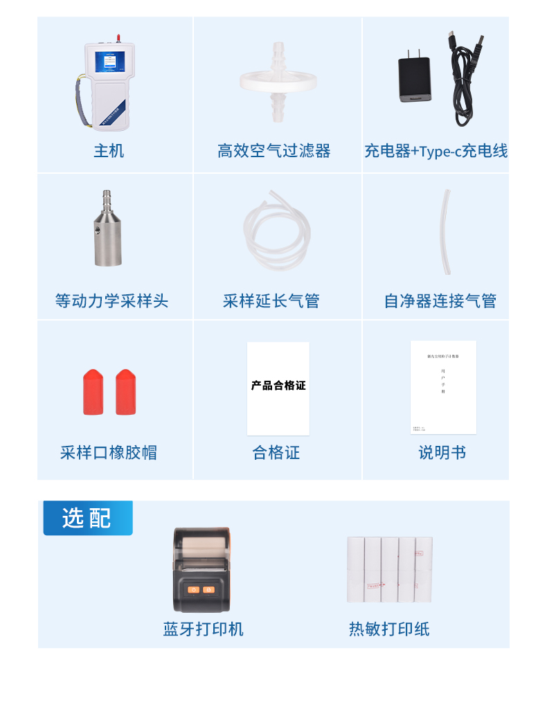 ?標配:等動力采樣頭、充電適配器、熱敏打印紙、高效空氣過濾器、熱敏打印機、測量延長氣管