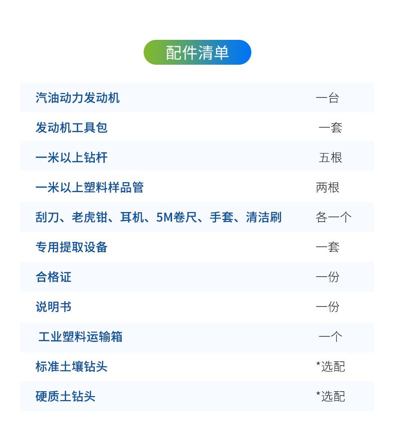 汽油動力發(fā)動機一臺,發(fā)動機工具包一套,標準土壤鉆頭、硬質(zhì)土鉆頭隨意選配,不小于1米的鉆桿5根、不小于1米的塑料樣品管2根,刮刀、老虎鉗、耳機、5M卷尺、手套、清潔刷各1個,專用提取設備1套、工業(yè)塑料運輸箱1個