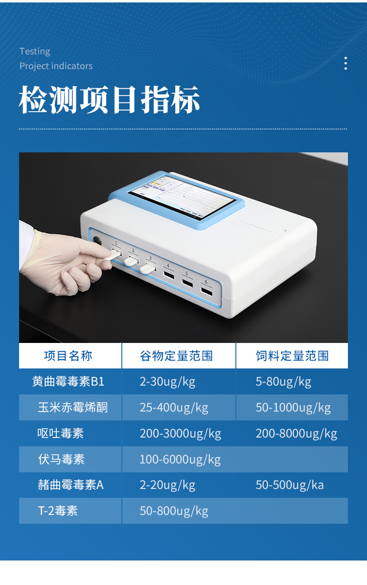 T-2毒素 | 50-800ug/kg | 玉米、小麥、大米、麥麩、豆粕、花生粕、玉米胚芽粕.DDGS、噴漿玉米皮及膨化玉米及成品飼料 |