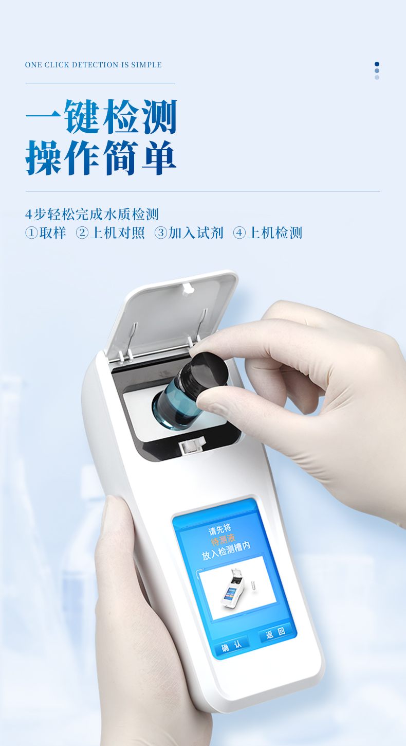 本儀器采用光電比色原理取代傳統(tǒng)的目視比色法。消除了人為誤差,因此測(cè)量分辨率大大提高。測(cè)量時(shí),把被測(cè)水樣放入光電比色池,儀表會(huì)直接讀取數(shù)據(jù)。