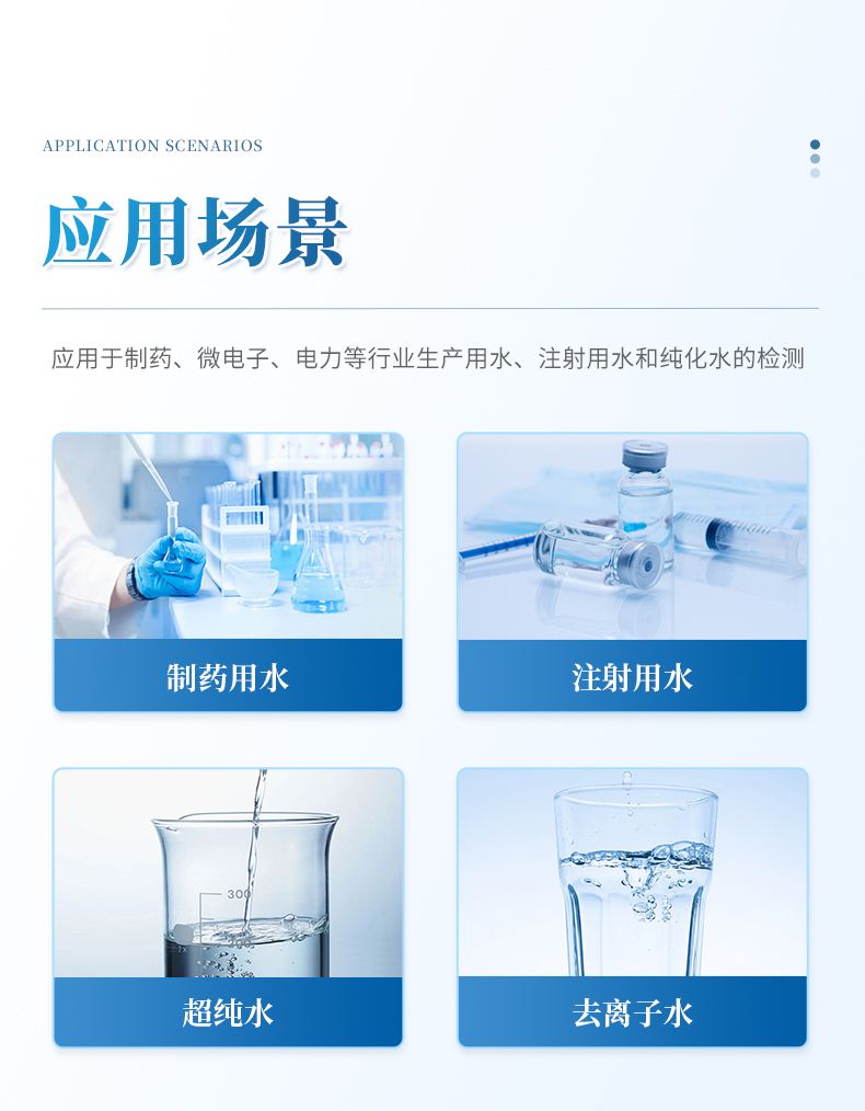 產(chǎn)品具有檢測限低、靈敏度高、響應速度快及穩(wěn)定性好等特點,操作界面簡潔,易于使用。可廣泛應用于制藥、微電子、電力等行業(yè)的生產(chǎn)用水、注射用水和純化水的檢測,是確保水質(zhì)安全、滿足藥典及相關(guān)行業(yè)法規(guī)要求的可靠工具。