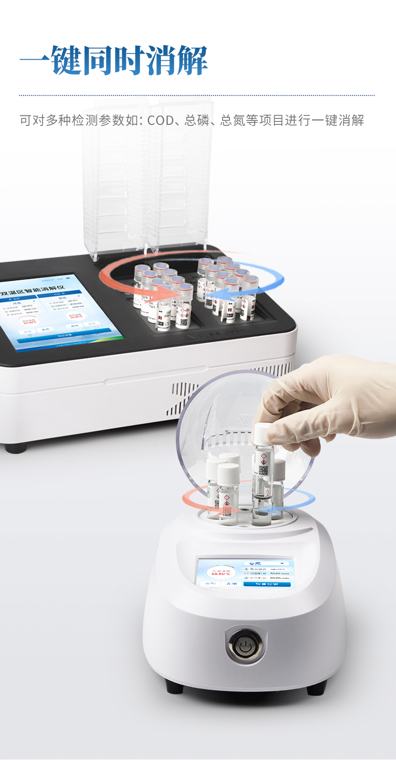 6、內(nèi)置COD、總磷、總氮、5個自定義消解指標,可直接使用,實現(xiàn)一鍵啟動消解;