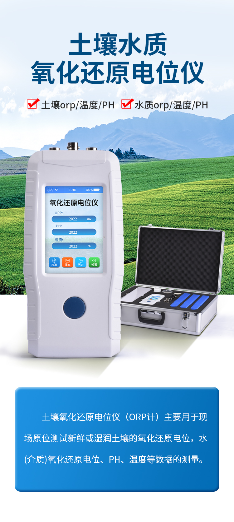 土壤氧化還原電位儀(ORP計(jì))主要用于現(xiàn)場(chǎng)原位測(cè)試新鮮或濕潤(rùn)土壤的氧化還原電位,水(介質(zhì))氧化還原電位、PH、溫度等數(shù)據(jù)的測(cè)量。符合《HJ746-2015土壤氧化還原電位的測(cè)定電位法》標(biāo)準(zhǔn)。