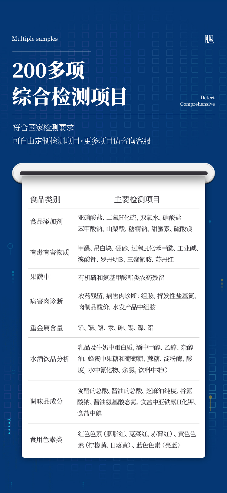 1、檢測(cè)項(xiàng)目:可快速檢測(cè)各類食品中的甲醛、二氧化硫、亞硝酸鹽、吊白塊、農(nóng)藥殘留的含量,儀器預(yù)留其他項(xiàng)目檢測(cè)程序和端口,根據(jù)日后需求可方便的自主增加檢測(cè)項(xiàng)目。