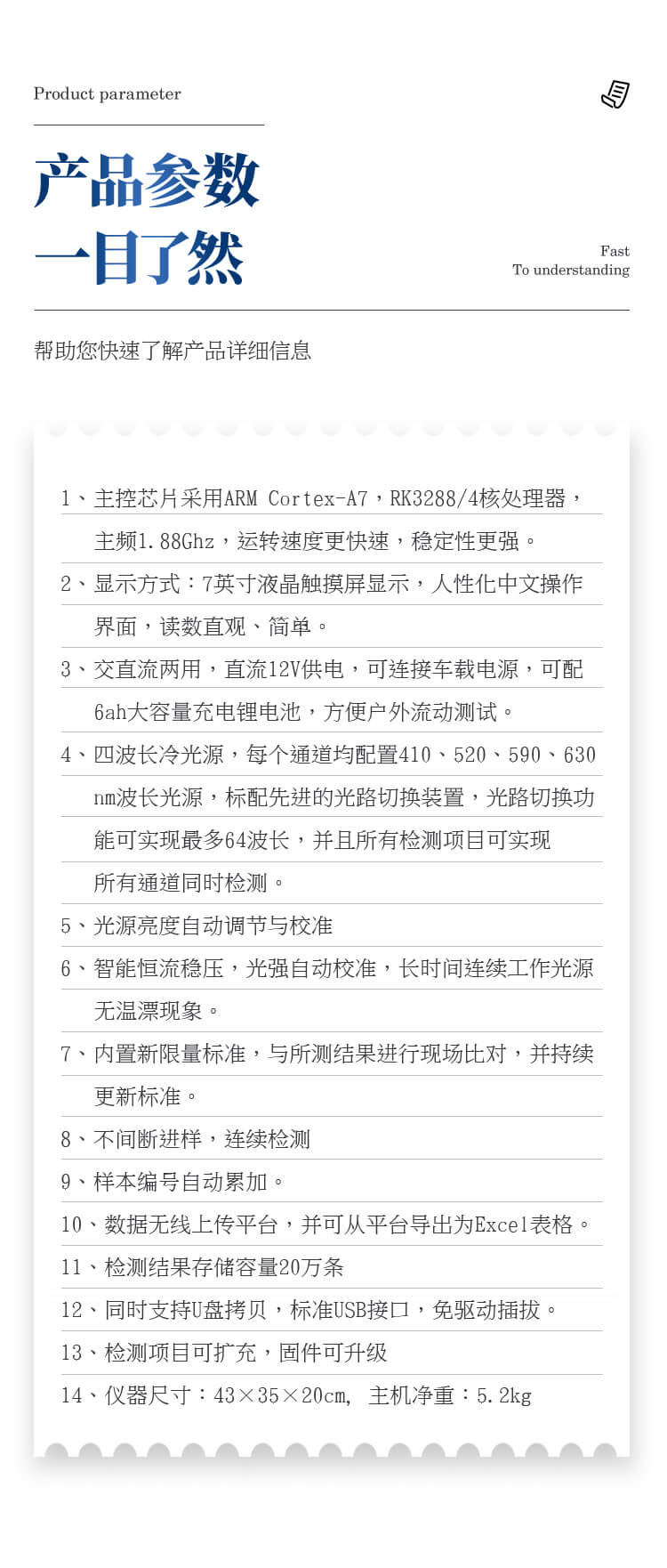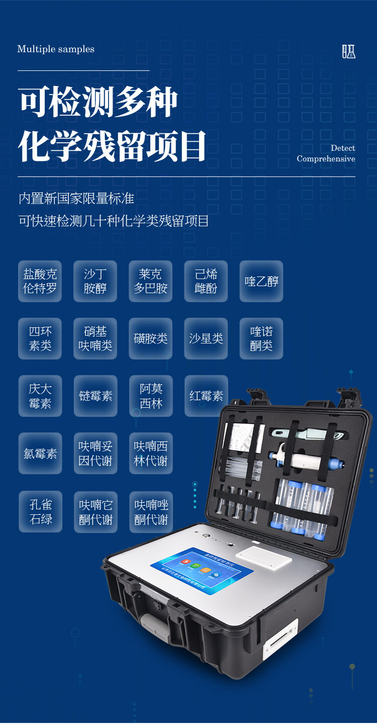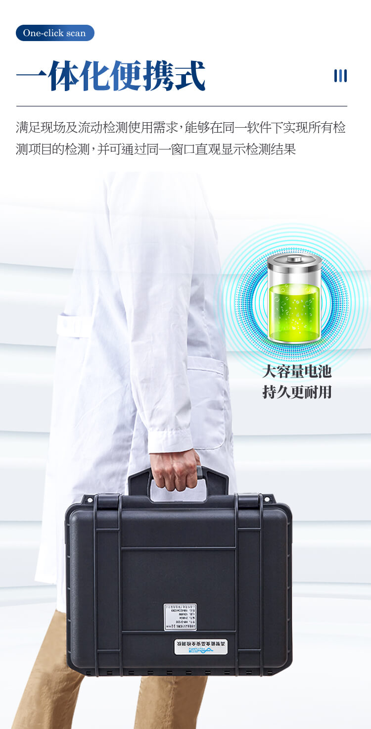 5、一體化便攜式快檢設(shè)備,滿足現(xiàn)場(chǎng)及流動(dòng)檢測(cè)使用需求,能夠在同一軟件下實(shí)現(xiàn)所有檢測(cè)項(xiàng)目的檢測(cè),并可通過同一窗口直觀顯示檢測(cè)結(jié)果。
