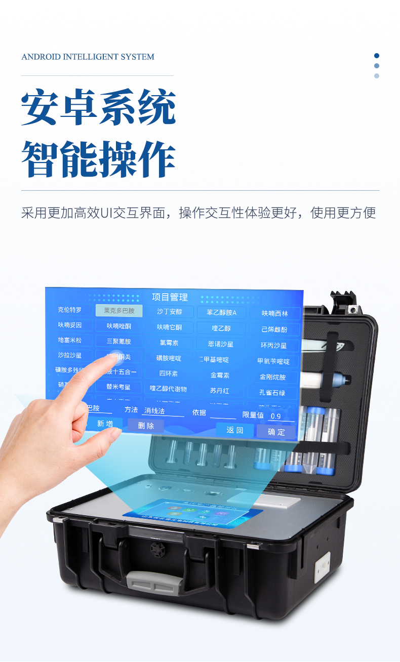 6、一體化便攜式快檢設(shè)備,滿足現(xiàn)場(chǎng)及流動(dòng)檢測(cè)使用需求,能夠在同一軟件下實(shí)現(xiàn)所有檢測(cè)項(xiàng)目的檢測(cè),并可通過同一窗口直觀顯示檢測(cè)結(jié)果。
