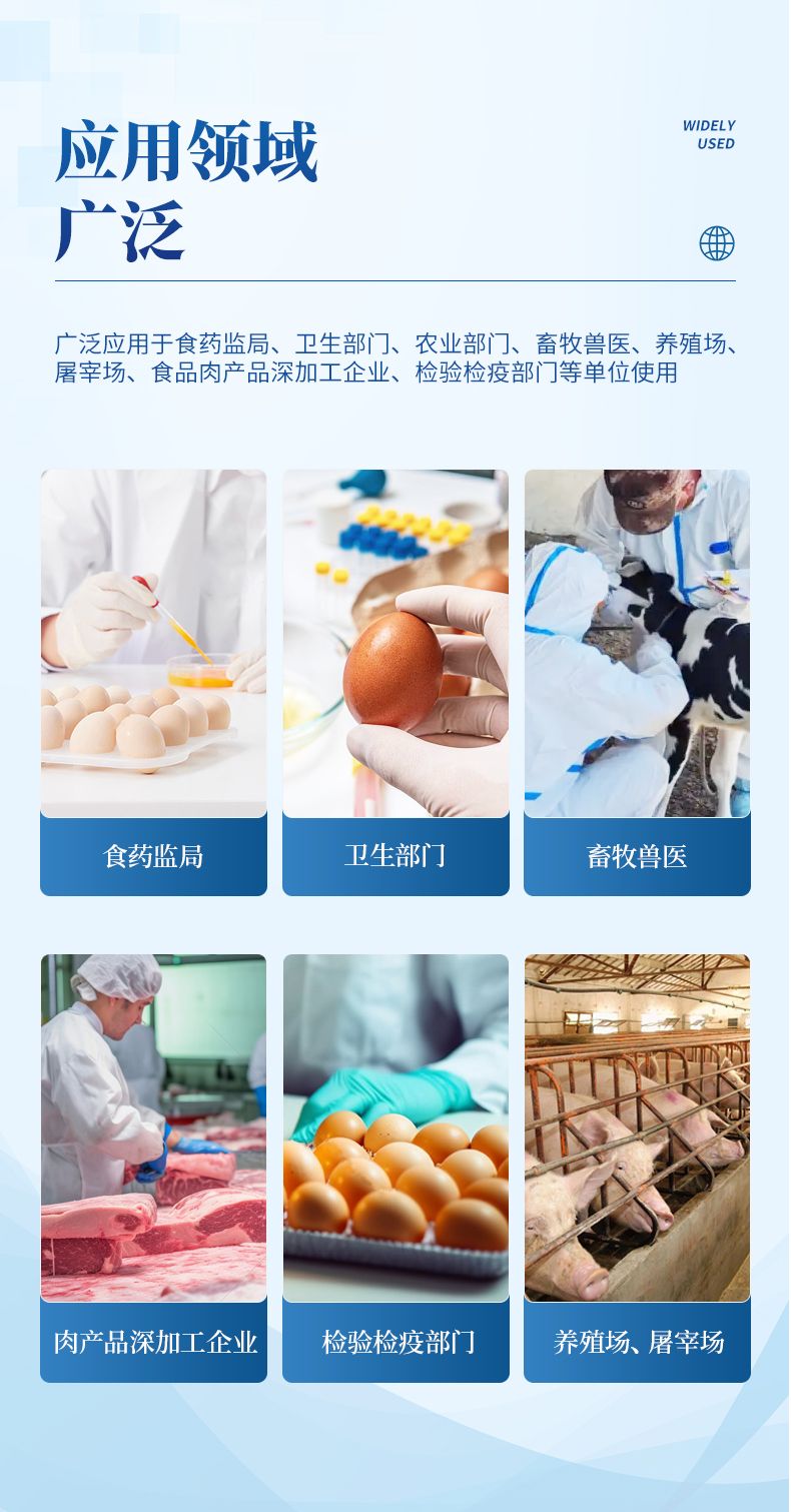 雞蛋抗生素檢測(cè)儀可適用于豬、雞、鴨、羊、牛奶等畜禽產(chǎn)品中獸藥殘留檢測(cè),如、萊克多巴胺、沙丁胺醇、恩諾沙星、氯霉素、鏈霉素、三聚氰胺、慶大霉素、磺胺類(lèi)、喹喏酮類(lèi)、呋喃類(lèi)、四環(huán)素類(lèi)、阿莫西林、孔雀石綠、(B1,B2,G1,G2,M1,M2 )、疾病診斷、環(huán)丙沙星、紅霉素、土霉素、喹乙醇、已烯雌酚等。并廣泛應(yīng)用于廣泛應(yīng)用于食藥監(jiān)局、衛(wèi)生部門(mén)、農(nóng)業(yè)部門(mén)、畜牧獸醫(yī)、養(yǎng)殖場(chǎng)、屠宰場(chǎng)、食品肉產(chǎn)品深加工企業(yè)、檢驗(yàn)檢疫部門(mén)等單位使用。