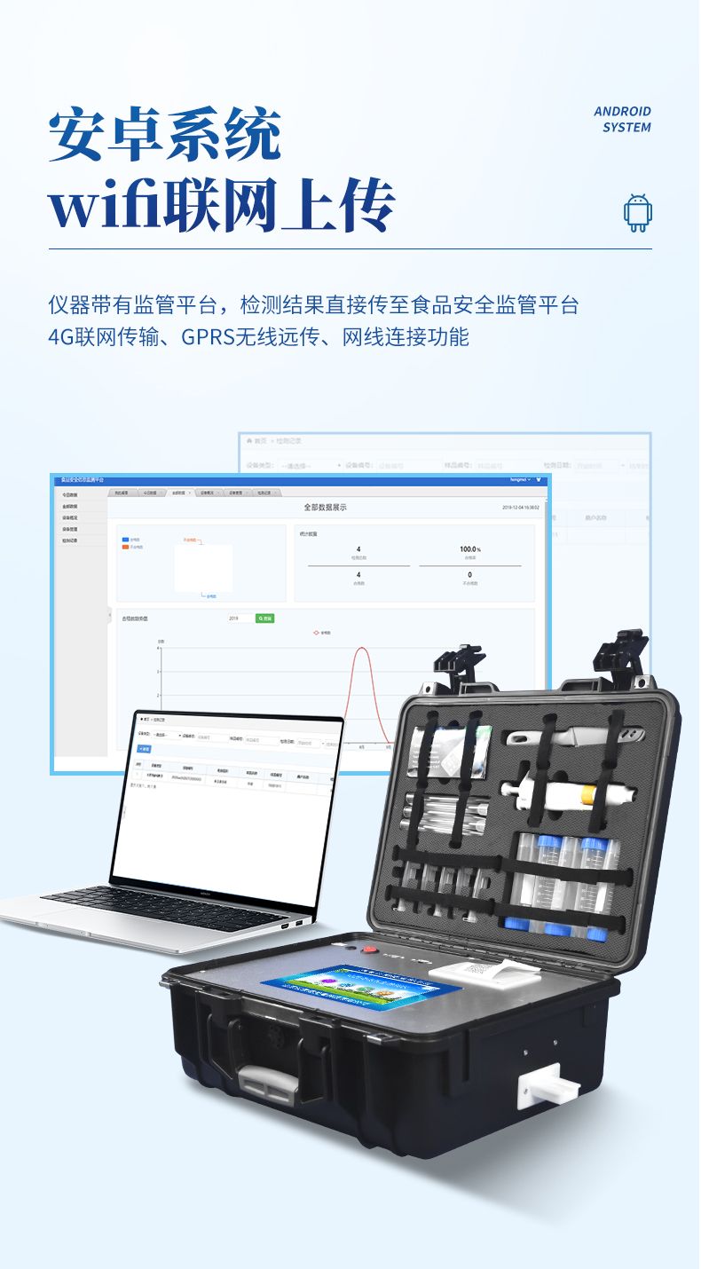 4、儀器帶有監(jiān)管平臺(tái),數(shù)據(jù)可局域網(wǎng)和互聯(lián)網(wǎng)數(shù)據(jù)上傳,檢測(cè)結(jié)果直接傳至食品安全監(jiān)管平臺(tái)。進(jìn)行區(qū)域食品安全監(jiān)管及大數(shù)據(jù)分析處理與數(shù)據(jù)統(tǒng)計(jì),檢測(cè)區(qū)域食品安全長(zhǎng)短期動(dòng)態(tài),達(dá)到食品安全問(wèn)題預(yù)估、預(yù)警
