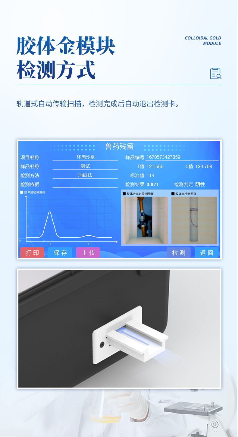 7、膠體金模塊檢測(cè)方式:軌道式自動(dòng)傳輸掃描,檢測(cè)完成后自動(dòng)退出檢測(cè)卡。