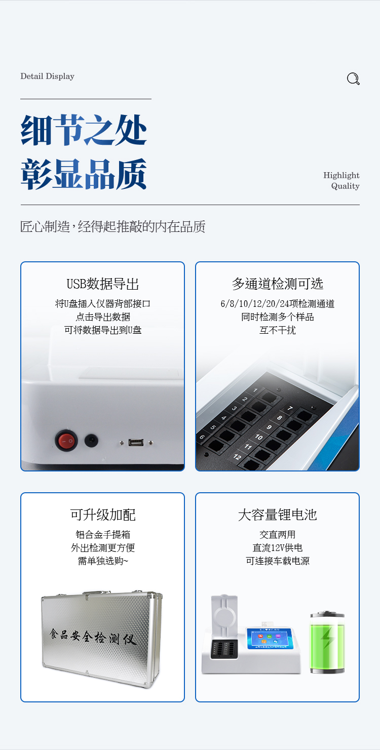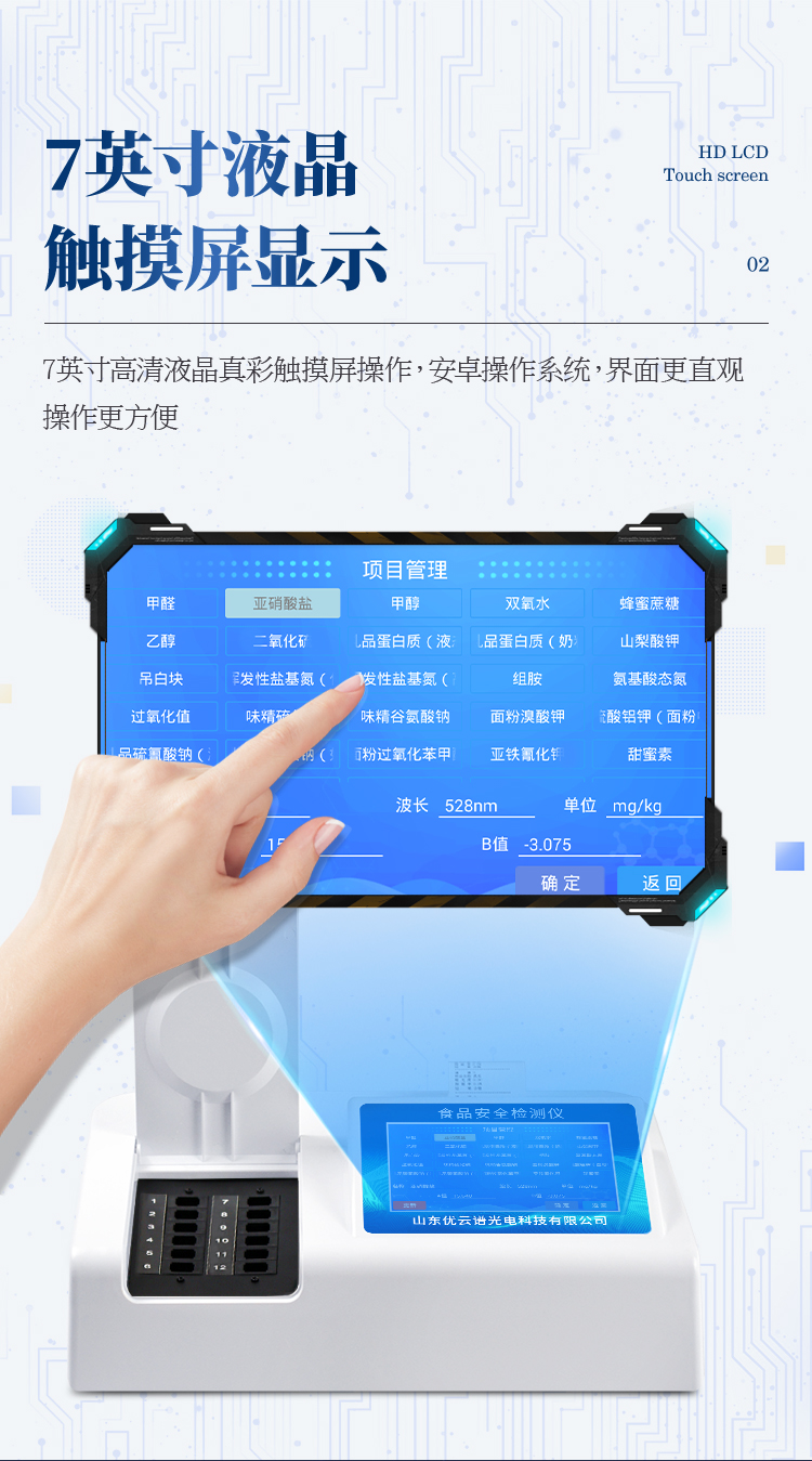 1、檢測(cè)項(xiàng)目:可快速檢測(cè)各類食品中的甲醛、二氧化硫、亞硝酸鹽、吊白塊、農(nóng)藥殘留的含量,儀器預(yù)留其他項(xiàng)目檢測(cè)程序和端口,根據(jù)日后需求可方便的自主增加檢測(cè)項(xiàng)目。