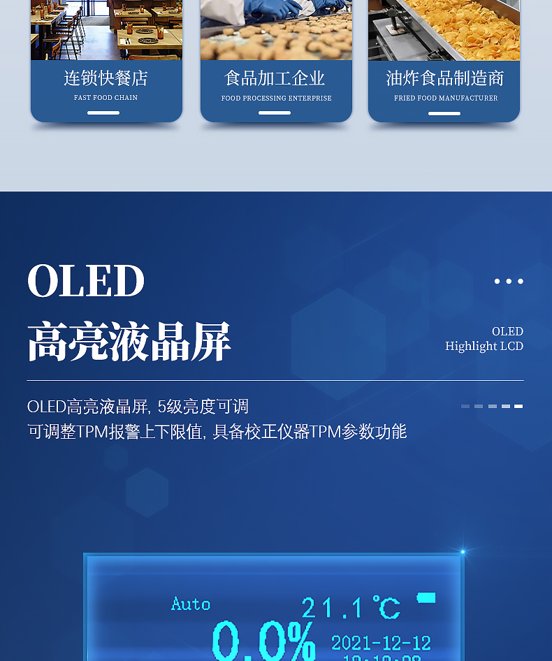 YP-SYP工業(yè)版特別適合食藥局、質(zhì)檢部門、學(xué)校企業(yè)食堂、連鎖快餐店、食品加工企業(yè)、油炸食品制造商、面包房等行業(yè)使用,也可以用于實(shí)驗(yàn)室對(duì)食用油品質(zhì)的初步篩選,對(duì)劣質(zhì)油、地溝油的鑒別等。能為您達(dá)到檢驗(yàn)油品品質(zhì)、節(jié)省食用油、保證產(chǎn)品的質(zhì)量、保證食品安全的目的。