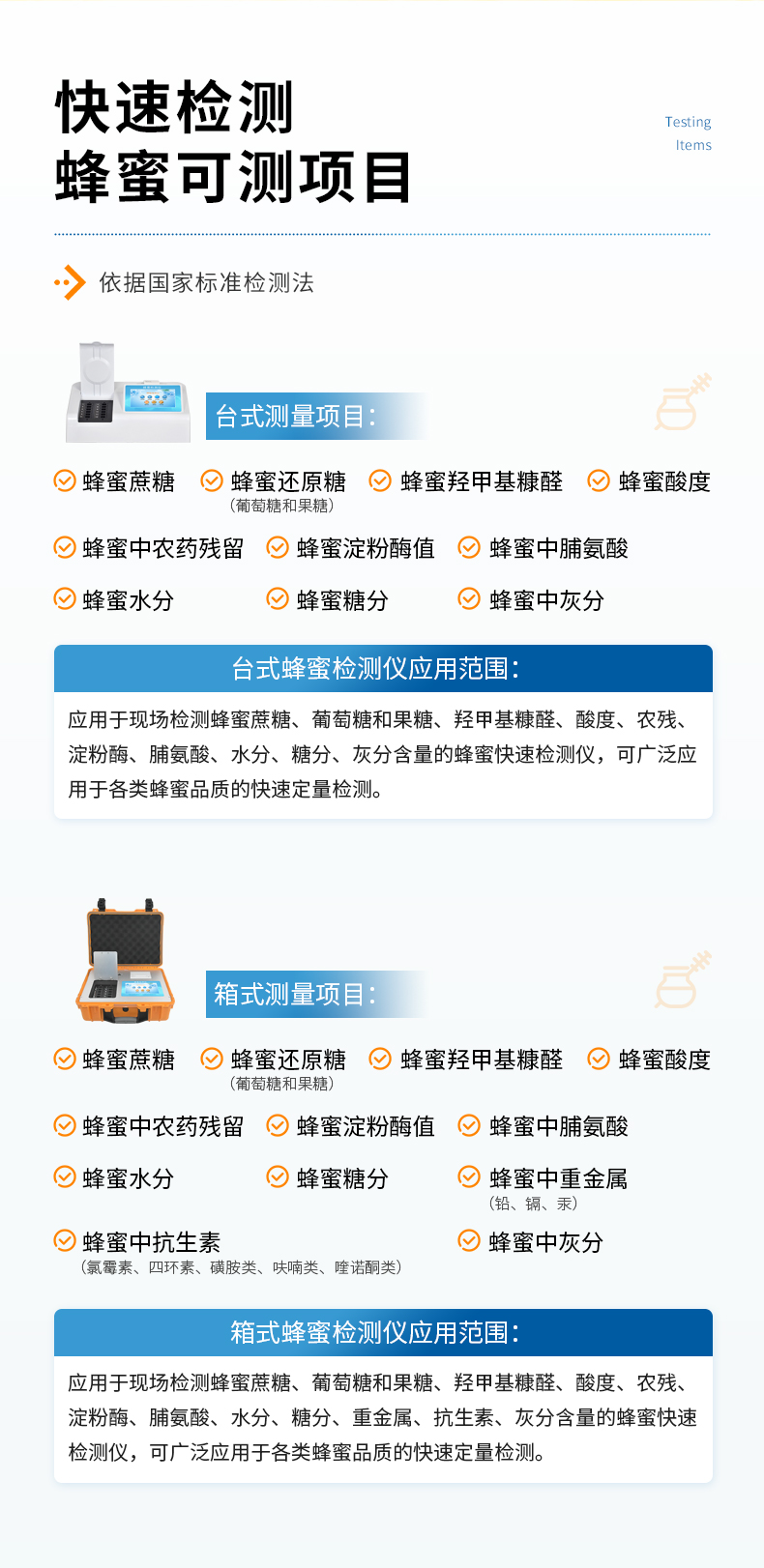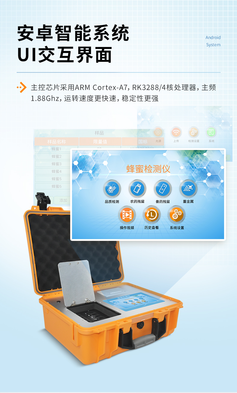 檢測項目:蜂蜜蔗糖、蜂蜜還原糖(葡萄糖和果糖)、蜂蜜羥甲基糠醛、蜂蜜酸度、蜂蜜中農(nóng)藥殘留、蜂蜜淀粉酶值、蜂蜜中脯氨酸、蜂蜜水分、蜂蜜糖分、蜂蜜中重金屬(鉛、鎘、汞)、蜂蜜中抗生素(氯霉素、四環(huán)素、磺胺類、呋喃類、喹諾酮類)、蜂蜜中灰分,應(yīng)用范圍:應(yīng)用于現(xiàn)場檢測蜂蜜蔗糖、葡萄糖和果糖、羥甲基糠醛、酸度、農(nóng)殘、淀粉酶、脯氨酸、水分、糖分、重金屬、抗生素、灰分含量的蜂蜜快速檢測儀,可廣泛應(yīng)用于各類蜂蜜品質(zhì)的快速定量檢測。