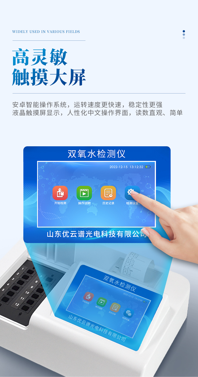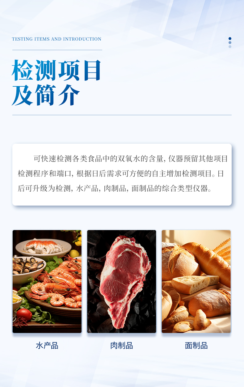 1、檢測(cè)項(xiàng)目:可快速檢測(cè)各類食品中的雙氧水的含量,儀器預(yù)留其他項(xiàng)目檢測(cè)程序和端口,根據(jù)日后需求可方便的自主增加檢測(cè)項(xiàng)目。日后可升級(jí)為檢測(cè),水產(chǎn)品,肉制品,面制品的綜合類型儀器。
