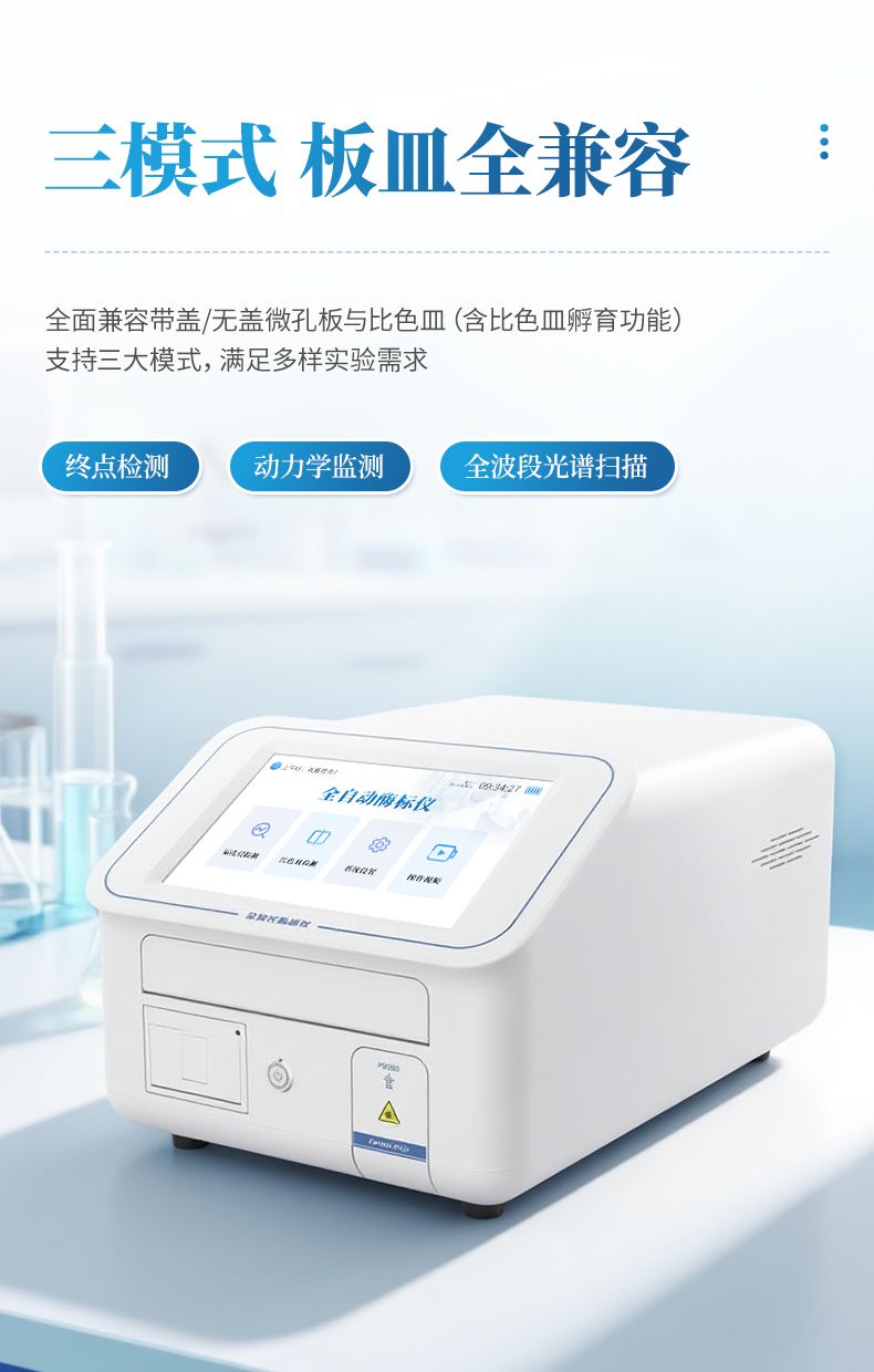 8. 支持終點(diǎn)檢測(cè)、動(dòng)力學(xué)監(jiān)測(cè)、全波段光譜掃描三大模式,兼容帶蓋/無(wú)蓋微孔板及比色皿(含比色皿孵育功能);