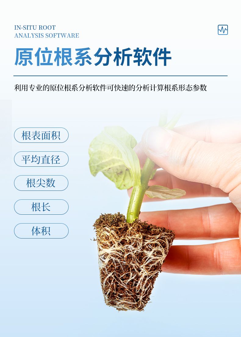 利用專業(yè)的原位根系分析軟件可快速的分析計算獲得總根長、平均直徑、表面積、總投影面積、總體積、根尖數(shù)等根系形態(tài)參數(shù)。