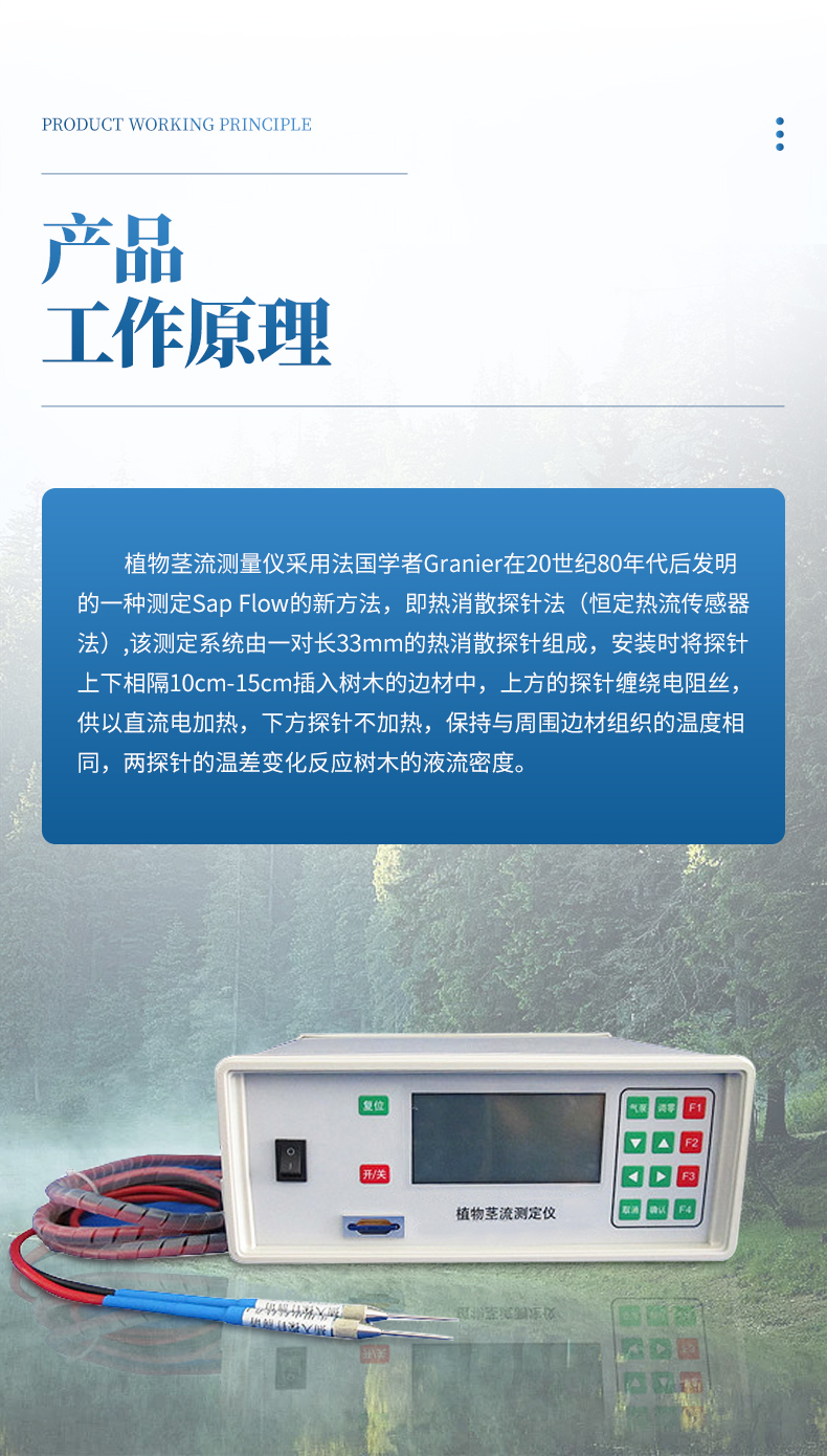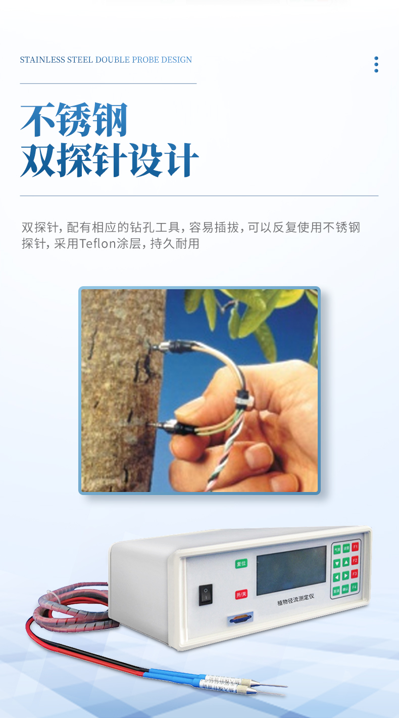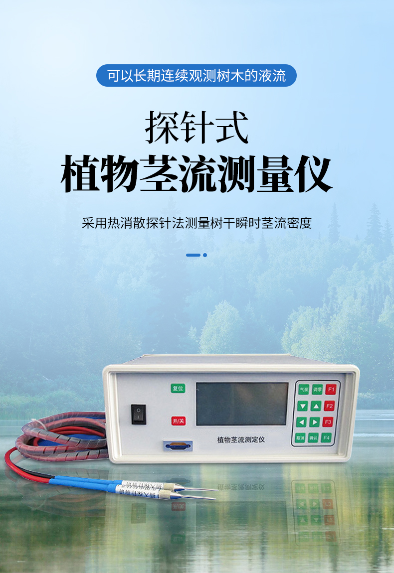 植物莖流測量儀采用法國學者Granier在20世紀80年代后發(fā)明的一種測定Sap Flow的新方法,即熱消散探針法(恒定熱流傳感器法)。該方法的數(shù)據(jù)采集具有準確穩(wěn)定的特點,而且可以連續(xù)不間斷的讀取數(shù)據(jù),因而數(shù)據(jù)具有系統(tǒng)性。該測 定系統(tǒng)由一對長33mm的熱消散探針組成,安裝時將探針上下相隔10cm-15cm插入樹木的邊材中,上方的探針纏繞電阻絲,供以直流電加熱,下方探針不 加熱,保持與周圍邊材組織的溫度相同,兩探針的溫差變化反應樹木的液流密度。