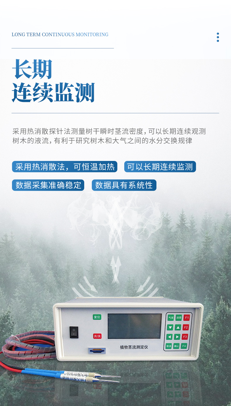 植物莖流測量儀采用熱消散探針法測量樹干瞬時莖流密度,可以長期連續(xù)觀測樹木的液流,有利于研究樹木和大氣之間的水分交換規(guī)律,并以此為觀測手段,長期監(jiān)測森林生態(tài)系統(tǒng)對環(huán)境變化的影響。對于造林綠化、森林管理和林業(yè)管理等具有重要的理論指導意義和應用價值。