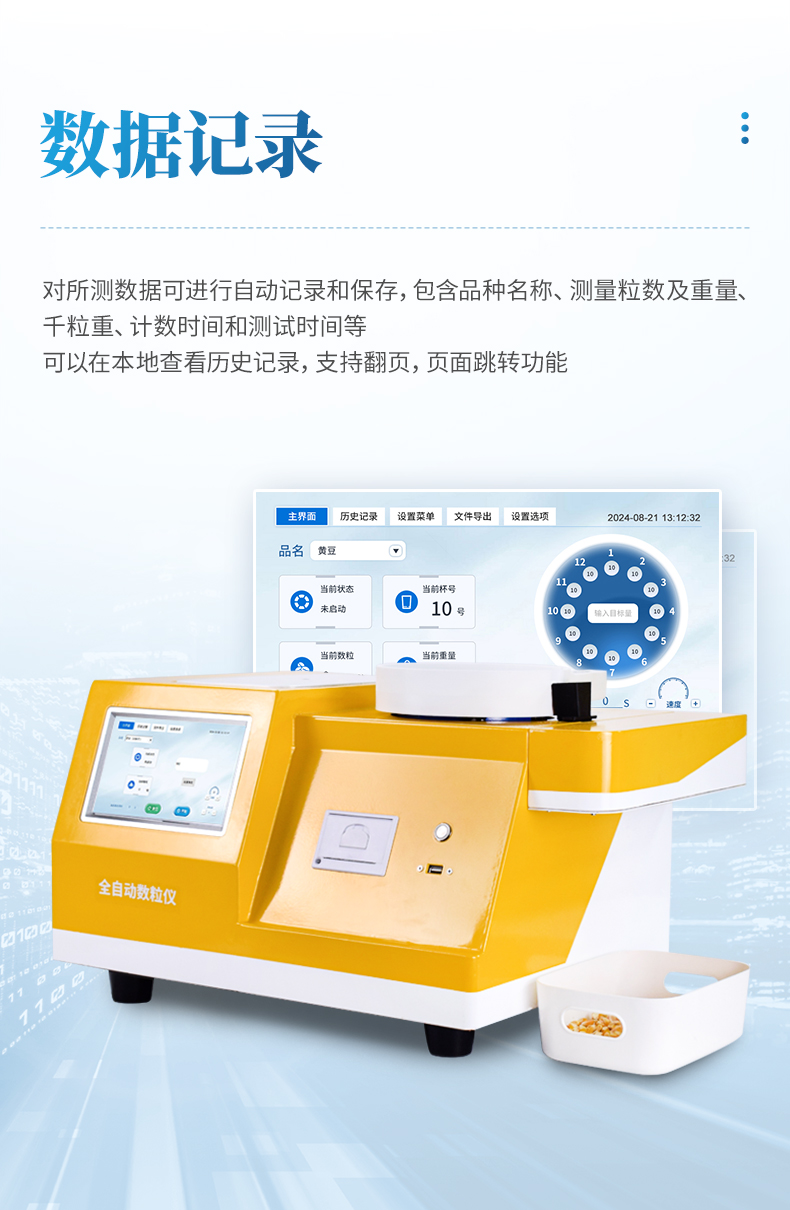 19、數(shù)據(jù)記錄:對(duì)所測(cè)數(shù)據(jù)可進(jìn)行自動(dòng)記錄和保存,包含品種名稱、測(cè)量粒數(shù)及重量、千粒重、計(jì)數(shù)時(shí)間和測(cè)試時(shí)間等。