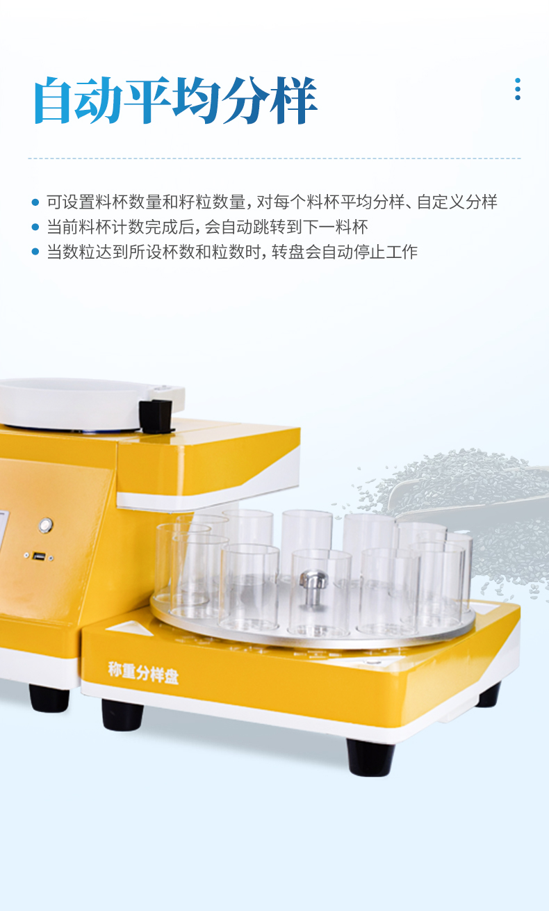 3、智能化程序設(shè)定:分樣型自動(dòng)數(shù)粒儀以數(shù)粒為核心,功能覆蓋全面,程序設(shè)定后,從料倉(cāng)到轉(zhuǎn)盤全自動(dòng)大批量分樣數(shù)粒,減少人工時(shí)間。
