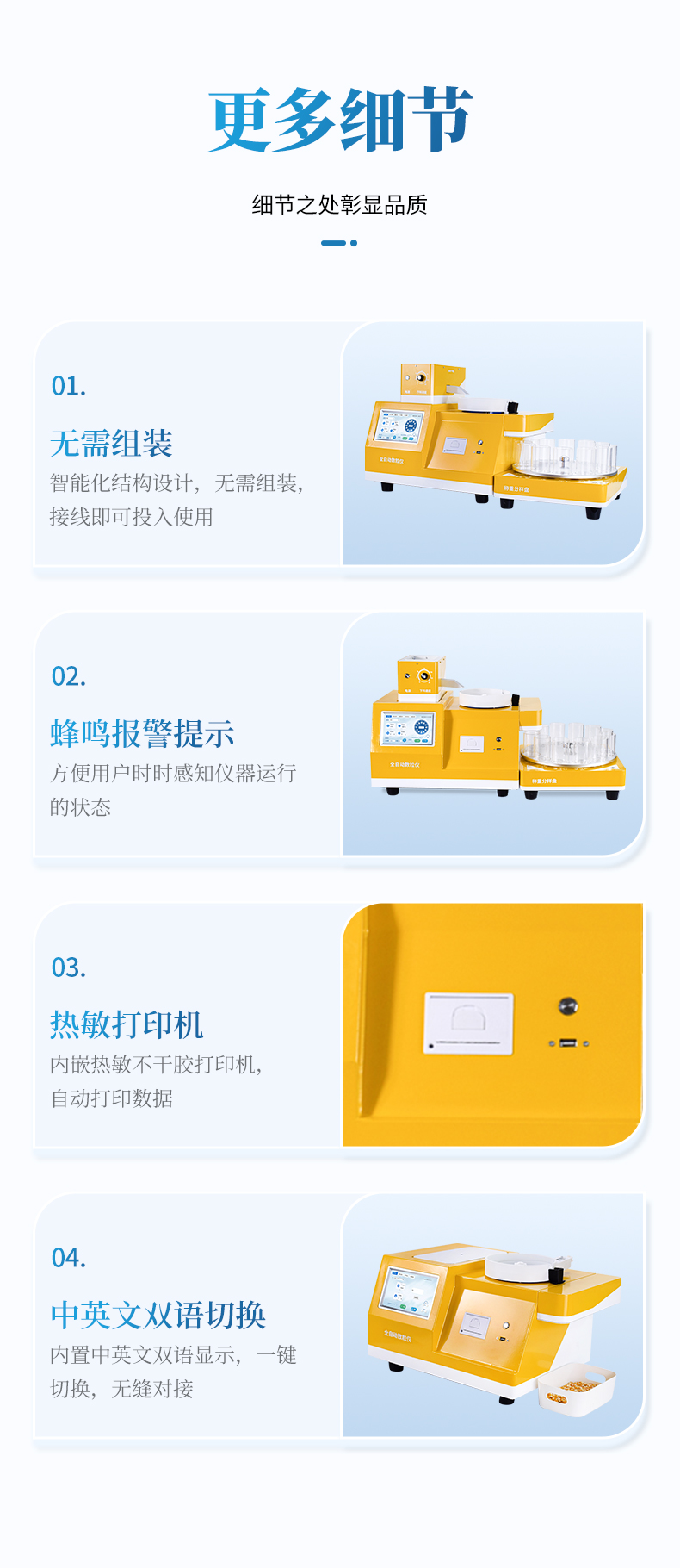 13、蜂鳴報(bào)警提示:每杯數(shù)粒完成滴一聲,全部數(shù)粒完成長(zhǎng)鳴一聲,故障時(shí)滴滴6聲。方便用戶時(shí)時(shí)感知儀器運(yùn)行的狀態(tài)。