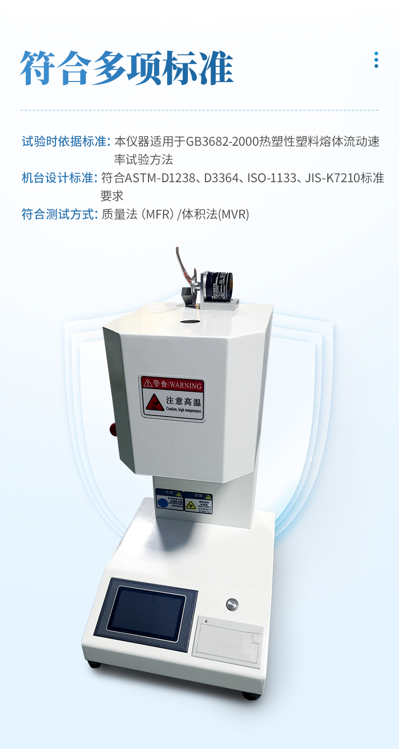 熔體流動(dòng)速率儀適用于《GB/T3682-2000熱塑性塑料熔體質(zhì)量流動(dòng)速率和熔體體積流動(dòng)速率的測定》國家標(biāo)準(zhǔn)中對規(guī)定的熱塑性塑料熔體質(zhì)量流動(dòng)速率的測定,本標(biāo)準(zhǔn)等同采用了ISO 1133:1997的規(guī)定,同時(shí)可滿足ASTM D1238測試標(biāo)準(zhǔn)。