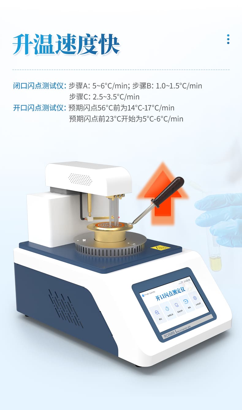 儀器按照GB/T 261-2021方法規(guī)定的升溫曲線加熱,溫度接近預(yù)期閃點(diǎn)值時(shí)自動(dòng)點(diǎn)火,當(dāng)出現(xiàn)閃點(diǎn)時(shí)儀器自動(dòng)鎖定結(jié)果,并顯示和打印,同時(shí)啟動(dòng)風(fēng)機(jī)自動(dòng)對(duì)加熱器進(jìn)行冷卻。